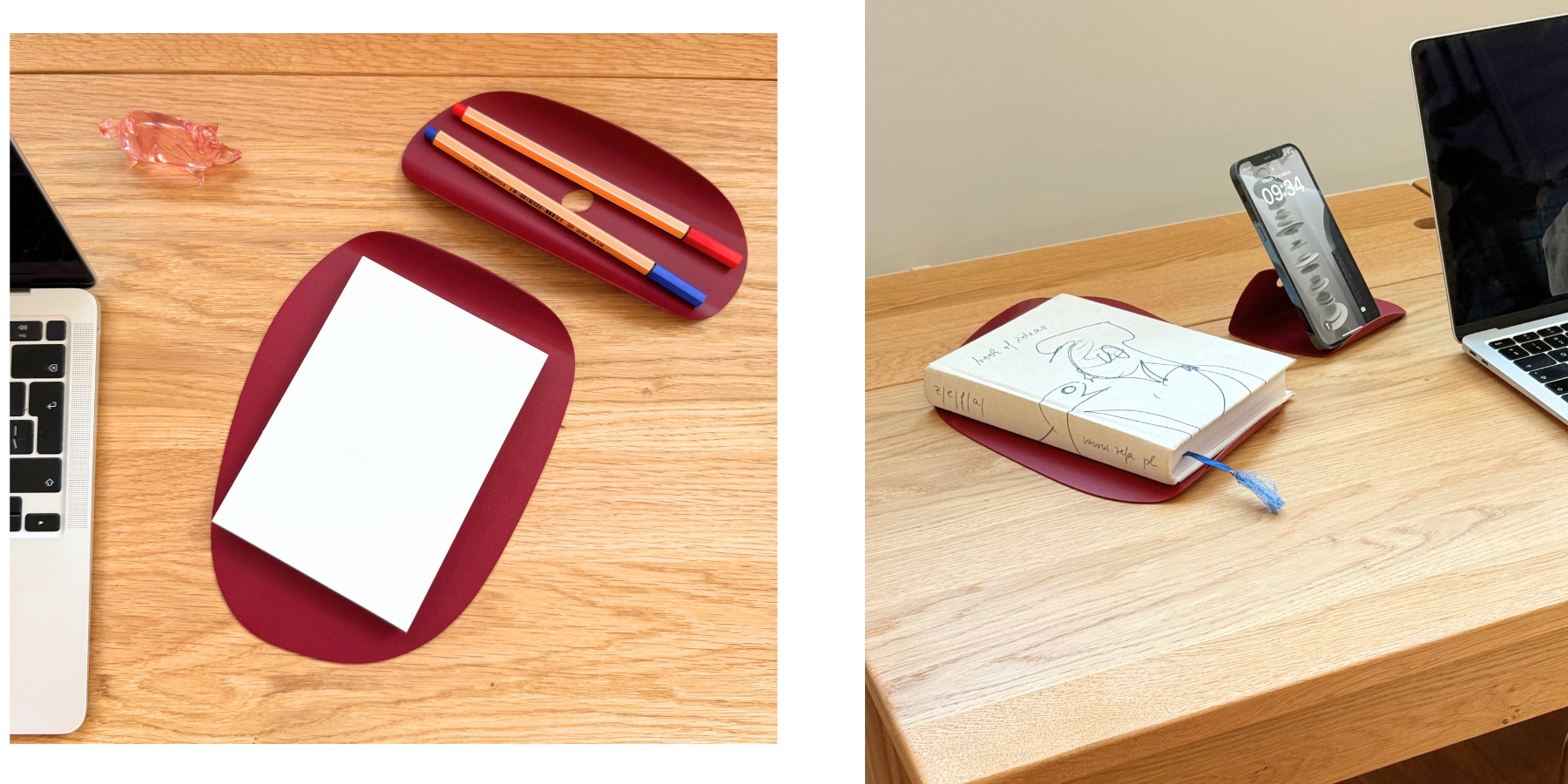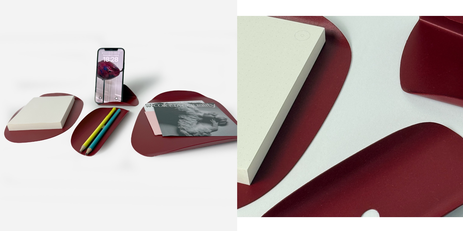 FLOW SET składa się z czterech akcesoriów, tacki na dokumenty, tacki na długopisy, tacki na notatnik i standu na telefon, oraz notatnika na szkice i zapiski. Wszystkie elementy wykonane są ze stali malowanej proszkowo lakierem strukturalnym w matowym wykończeniu, co nadaje im rzeźbiarski charakter i trwałość.