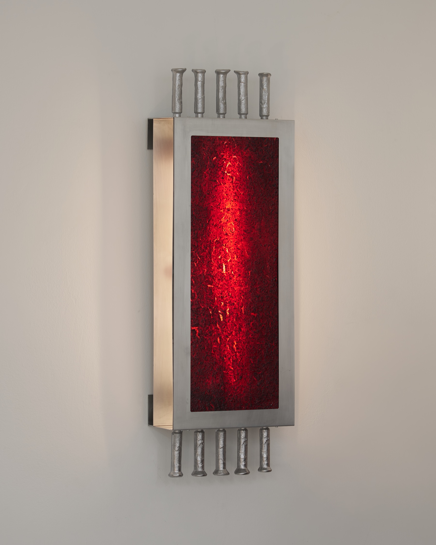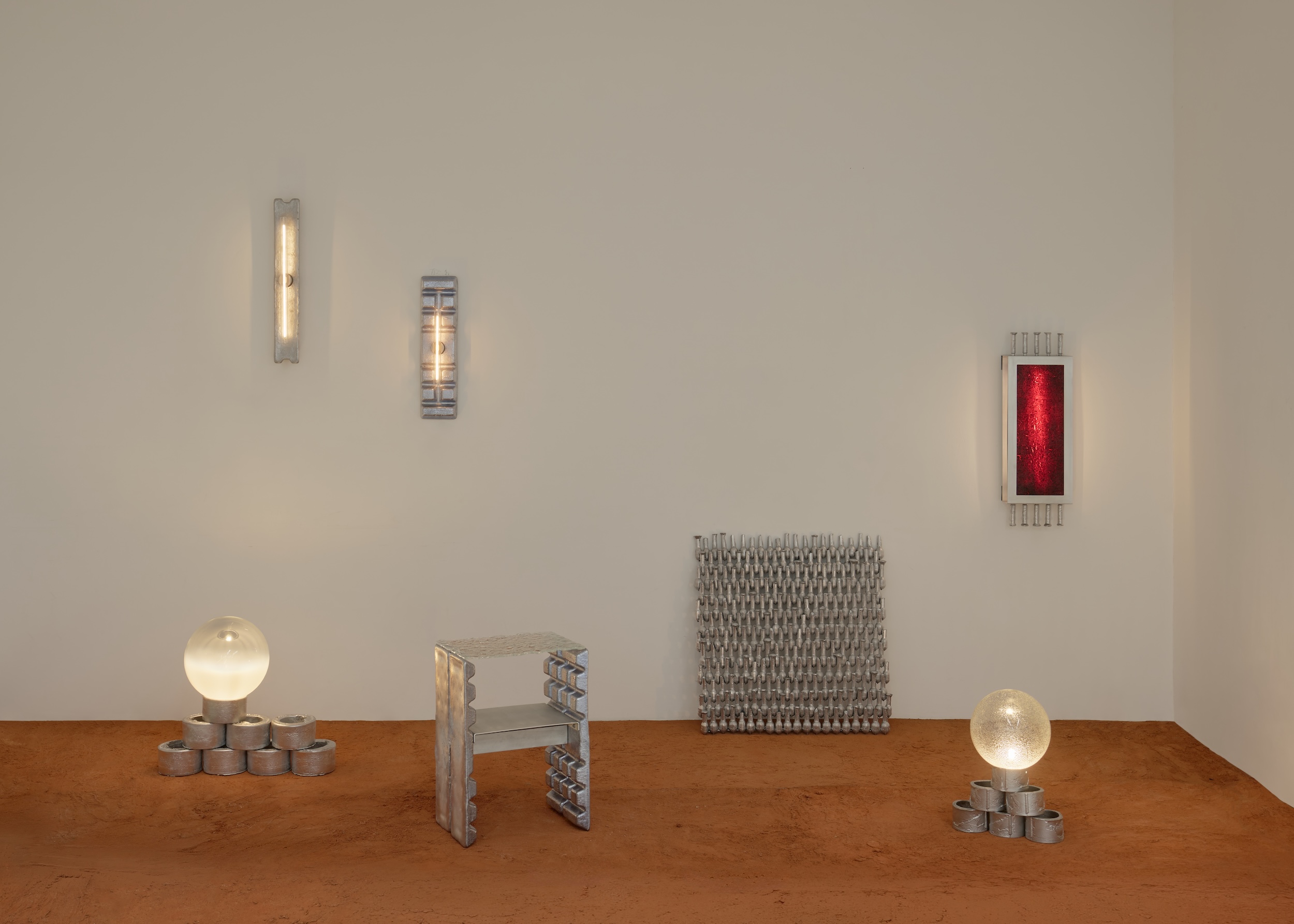 Wystawa działa na więcej niż jednym poziomie. Przestrzeń została przekształcona w immersyjne środowisko: podłoga z mączki ceglanej tworzy czerwony, „marsjański” krajobraz, światło buduje rytm i głębię, autorski zapach (stworzony przez Mateusza Wójcika) dopełnia całość. To nie jest scenografia. To środowisko, które reaguje na obecność widza.