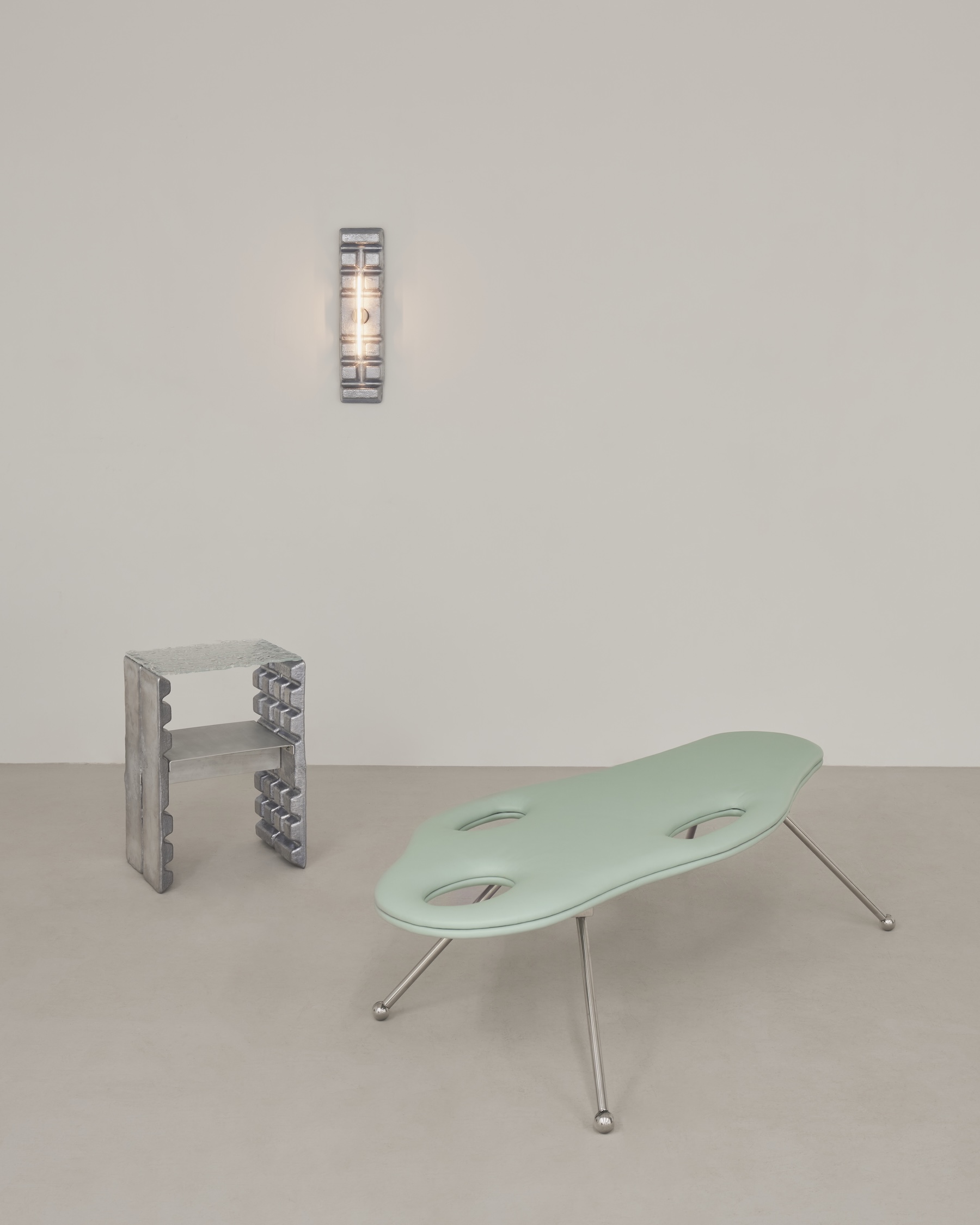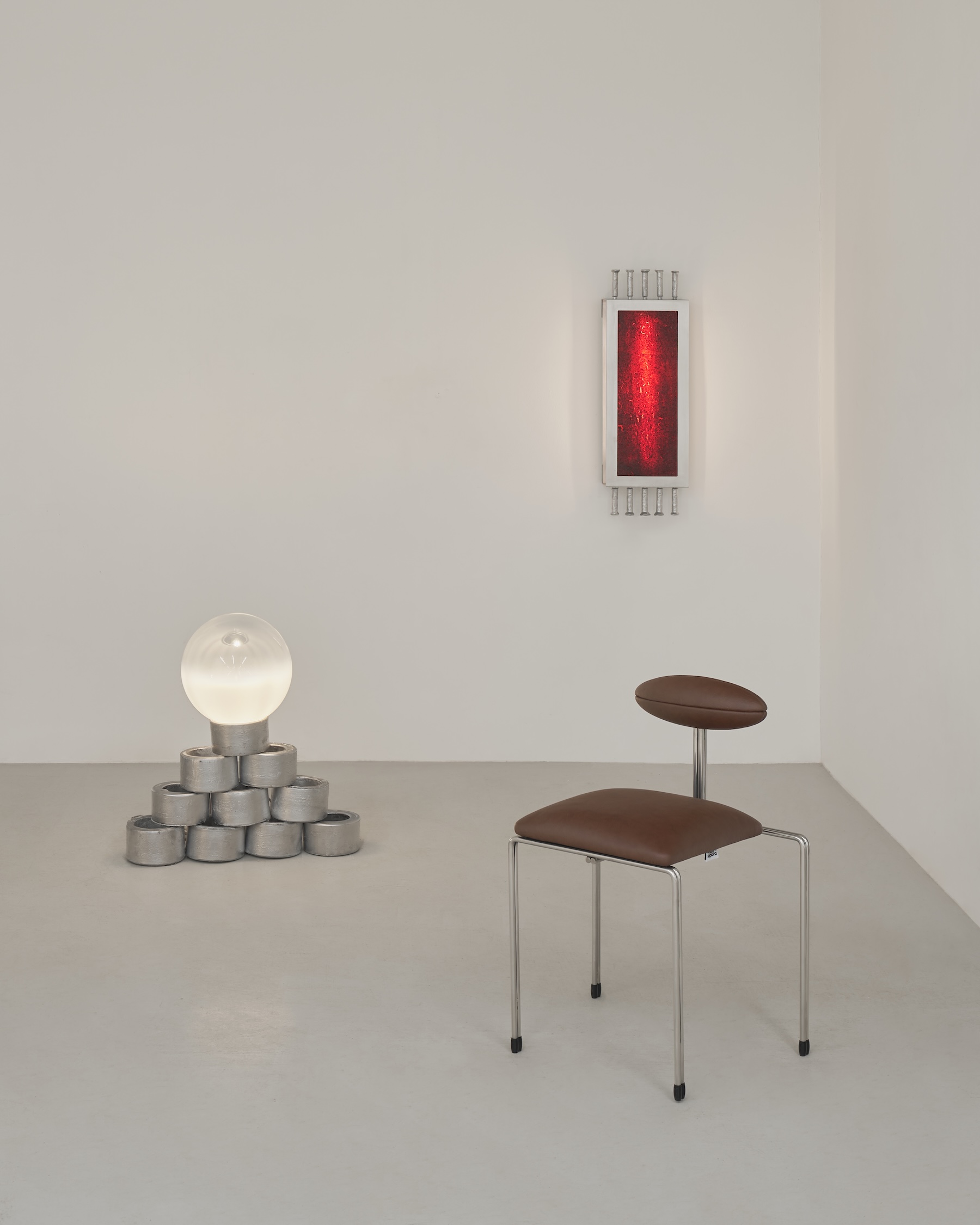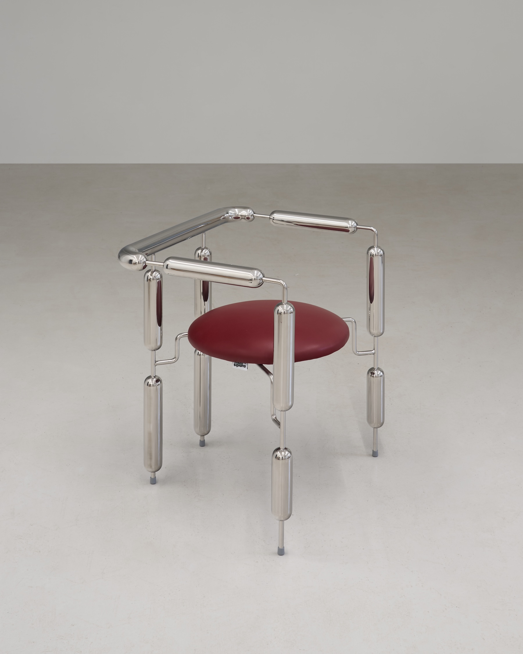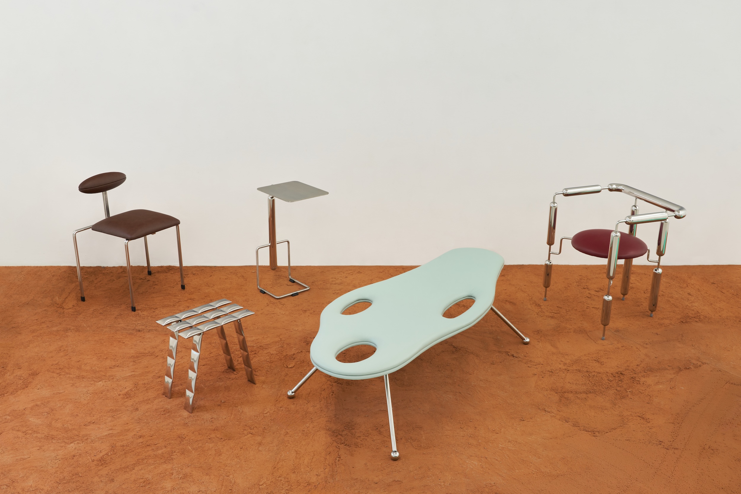 Siłą wystawy jest dialog dwóch odmiennych praktyk. Mati Sipiora operuje formą balansującą między funkcją a rzeźbą. Jego obiekty są wyraziste, niemal narracyjne. W Mediolanie pokazuje premierowo: leżankę Lovecraft, organiczną, niejednoznaczną formę balansującą między komfortem a niepokojem, krzesło Zeppelin inspirowane aerodynamiką i historią podboju nieba. Towarzyszą im wcześniejsze realizacje: fotel Poodle, stolik Pluto i taboret Cosmic budujące świat, w którym funkcja spotyka się z wyobrażeniem.