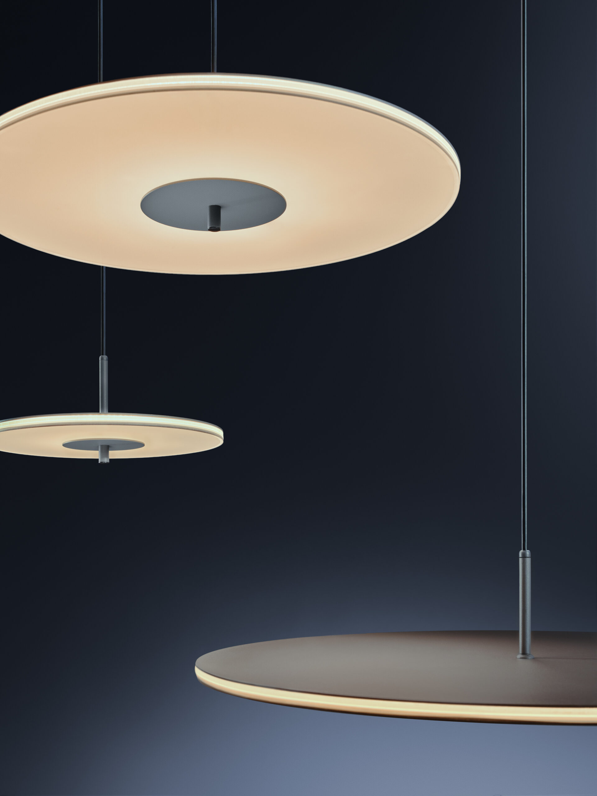 NOVA to seria ultracienkich opraw oświetleniowych, dostępnych w trzech rozmiarach, wykonanych z dymionego szkła hartowanego. Jej forma jest niemal graficzna, świetlisty dysk, który zdaje się unosić w przestrzeni, emitując miękkie, równomierne światło. To oświetlenie, które nie narzuca się wnętrzu, lecz staje się jego naturalnym elementem, łącząc funkcję światła głównego z nastrojowym budowaniem atmosfery.