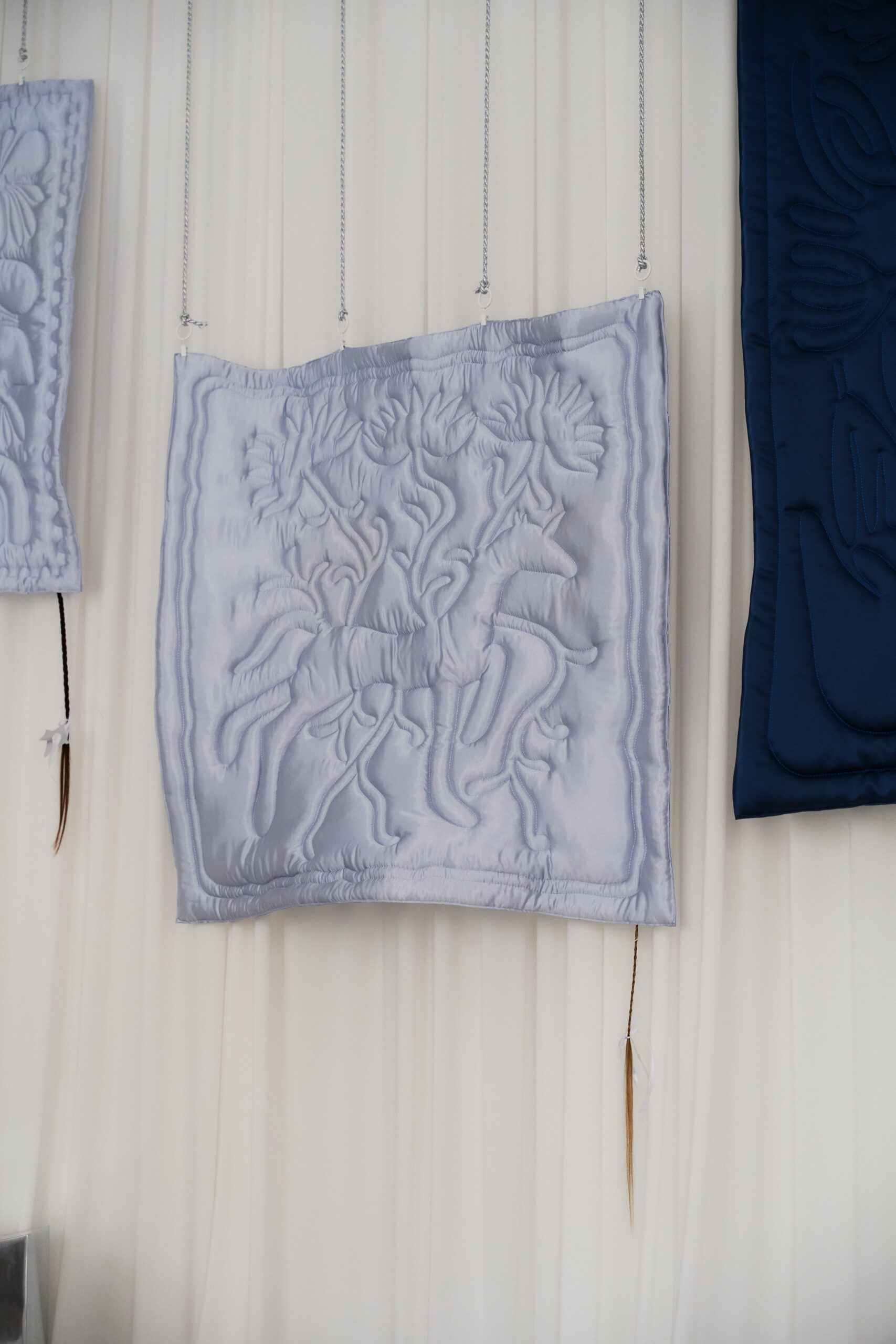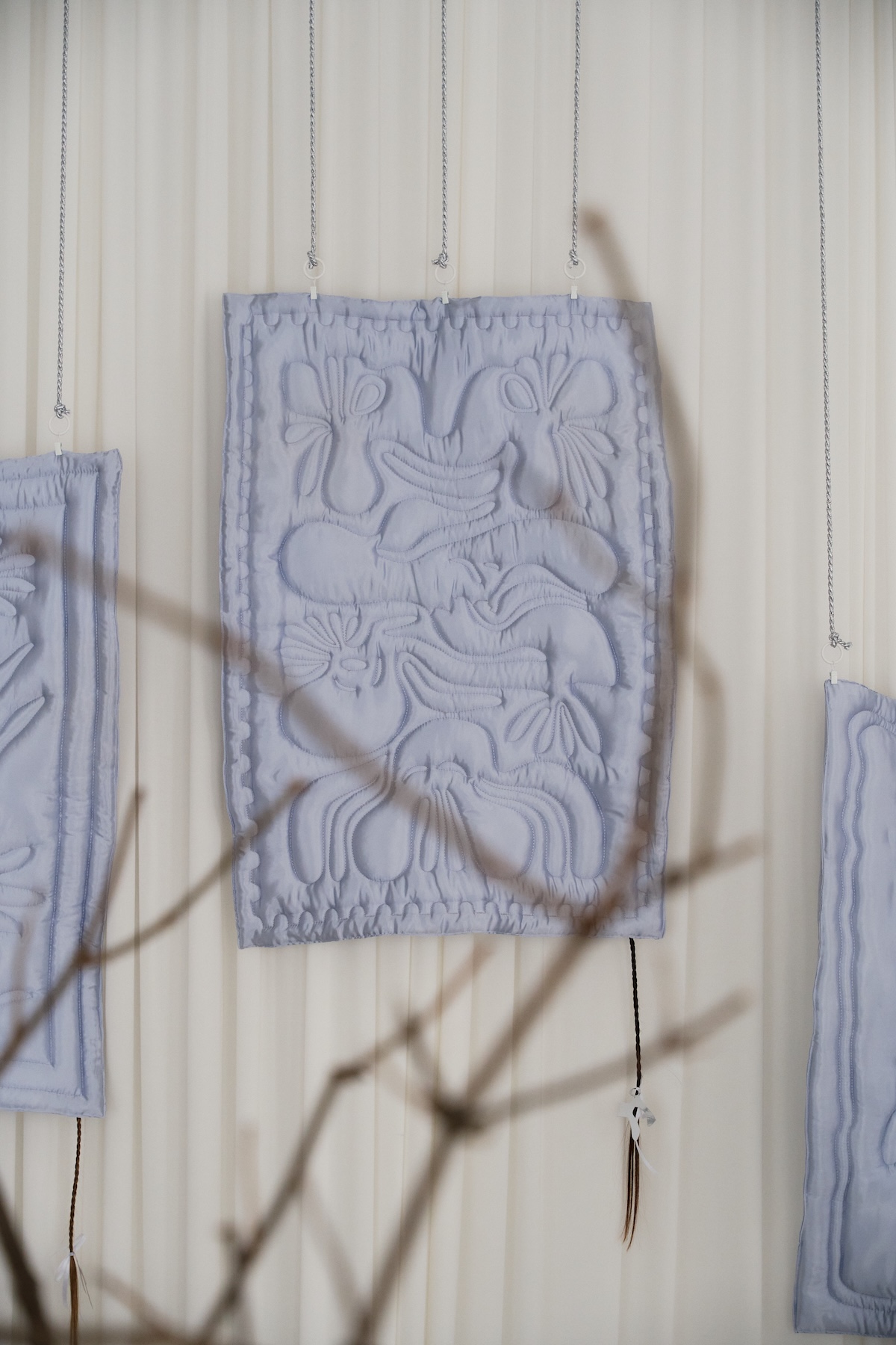 Jednym z najbardziej poruszających elementów są małe warkoczyki z naturalnych włosów, przymocowane do kocyków. Inspiracją była stara wiktoriańska tradycja tworzenia obrazów z włosów kosmyków oddawanych ukochanym jako talizman na szczęście. Ten gest intymności, delikatności i bliskości został przeniesiony w tekstylną formę, która jednocześnie przyciąga i niepokoi.