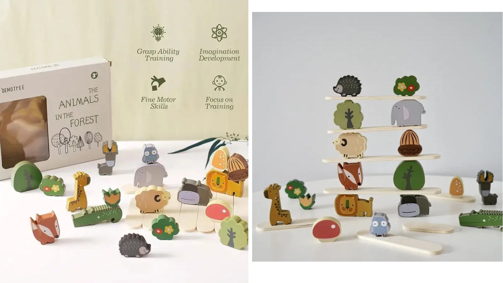 to drewniana układanka, która w niezwykle prosty sposób pomaga dzieciom rozwijać koncentrację, kreatywność i motorykę. Kolorowe zwierzątka można układać jedno na drugim, tworząc coraz wyższe i bardziej fantazyjne konstrukcje — zabawa wymaga skupienia, cierpliwości i precyzyjnych ruchów, dzięki czemu dzieci ćwiczą umiejętności, które później przydają się w szkole.