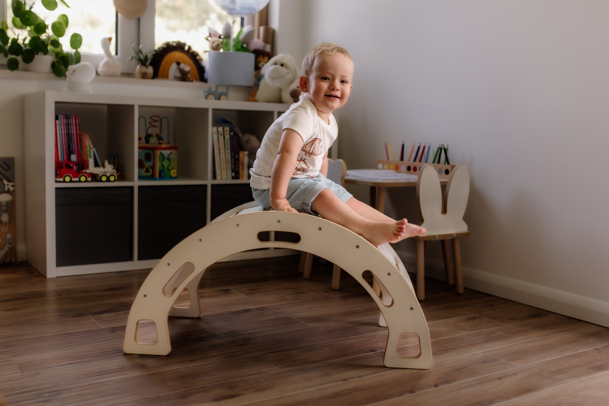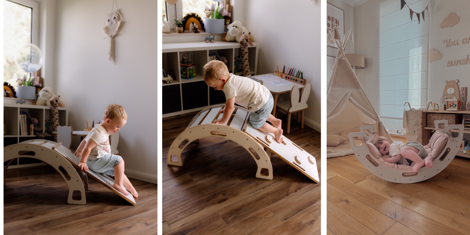 Flagowy zestaw OBUBU zamienia pokój dziecka w domowy plac zabaw. Jego sercem jest drewniany bujak, który może być łódką, mostem, tunelem, hamakiem albo bazą, dokładnie tym, czego akurat potrzebuje mały odkrywca. Miękka poducha dodaje mu funkcji strefy odpoczynku i wyciszenia. Drugim elementem zestawu jest deska 2w1: z jednej strony mini ścianka wspinaczkowa, z drugiej zjeżdżalnia, która zapewnia mnóstwo ruchu i satysfakcji. W połączeniu z bujakiem daje dziesiątki konfiguracji i niekończącą się zabawę.