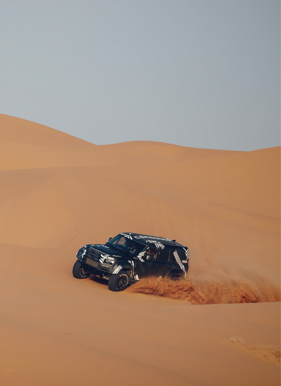 – Największym wyzwaniem dla nas jest zbudowanie samochodu, który poradzi sobie w tych ekstremalnych warunkach. W kategorii Stock zadanie jest o tyle trudne, że liczba modyfikacji, które możemy tu wprowadzić jest bardzo niewielka i ogranicza się do wyposażenia w obowiązkową klatkę bezpieczeństwa, i kilku niewielkich zmian szczególnie w układzie chłodzenia i tylnym zawieszeniu, które musi poradzić sobie z 500-litrowym bakiem paliwa umieszczonym w bagażniku. Poza tym, to w pełni seryjny model OCTA, wprowadzony do gamy Defendera w tym roku – mówi Jack Lambert, head of technical integration Deffender Rally. Choć przed nami rozpościera się bezkres pustyni, z bliska nie jest wcale jednorodną strukturą. W praktyce każdy kilometr jest zmianą akapitu. Z północy dociera poszarpany oddech Atlasu, więc jednym razem jedziemy kamienistą sekcją, gdzie liczy się linia i pokora wobec uskoku, innym razem wpadamy w szybkie szutry — tam ważny jest rytm: luz na kierownicy tuż przed garbem, oddech skrzyni, wiara w sztywny amortyzator. A potem przychodzi piasek.
