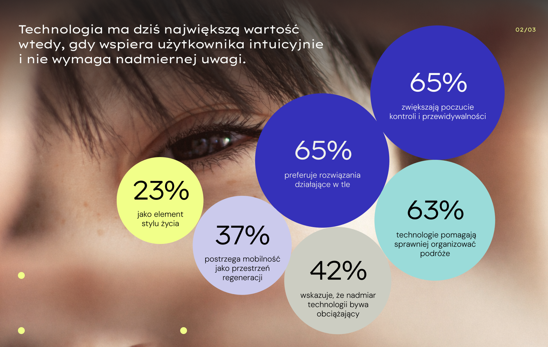 Jest jeszcze jeden wątek, który dobrze oddaje klimat naszych czasów: zmęczenie technologią. 63% respondentów mówi, że technologia im pomaga, 65%, że daje kontrolę, ale aż 42% czuje jej nadmiar w swoim życiu. Czyli nie chodzi o to, żeby ją wyłączyć. Chodzi o to, żeby przestała być widoczna. Najlepsza technologia to dziś taka, która działa w tle.