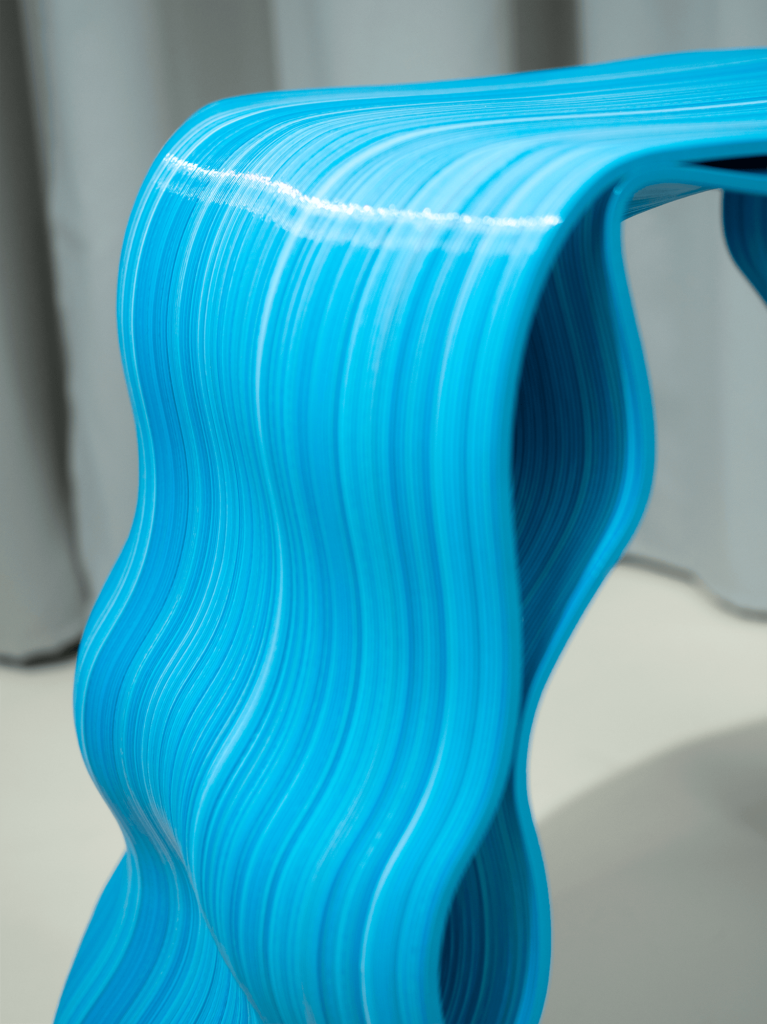 Obiekt zakorzeniony w estetyce Memphis i Space Age, pełen falujących linii, opływowych kształtów i rytmicznych załamań.