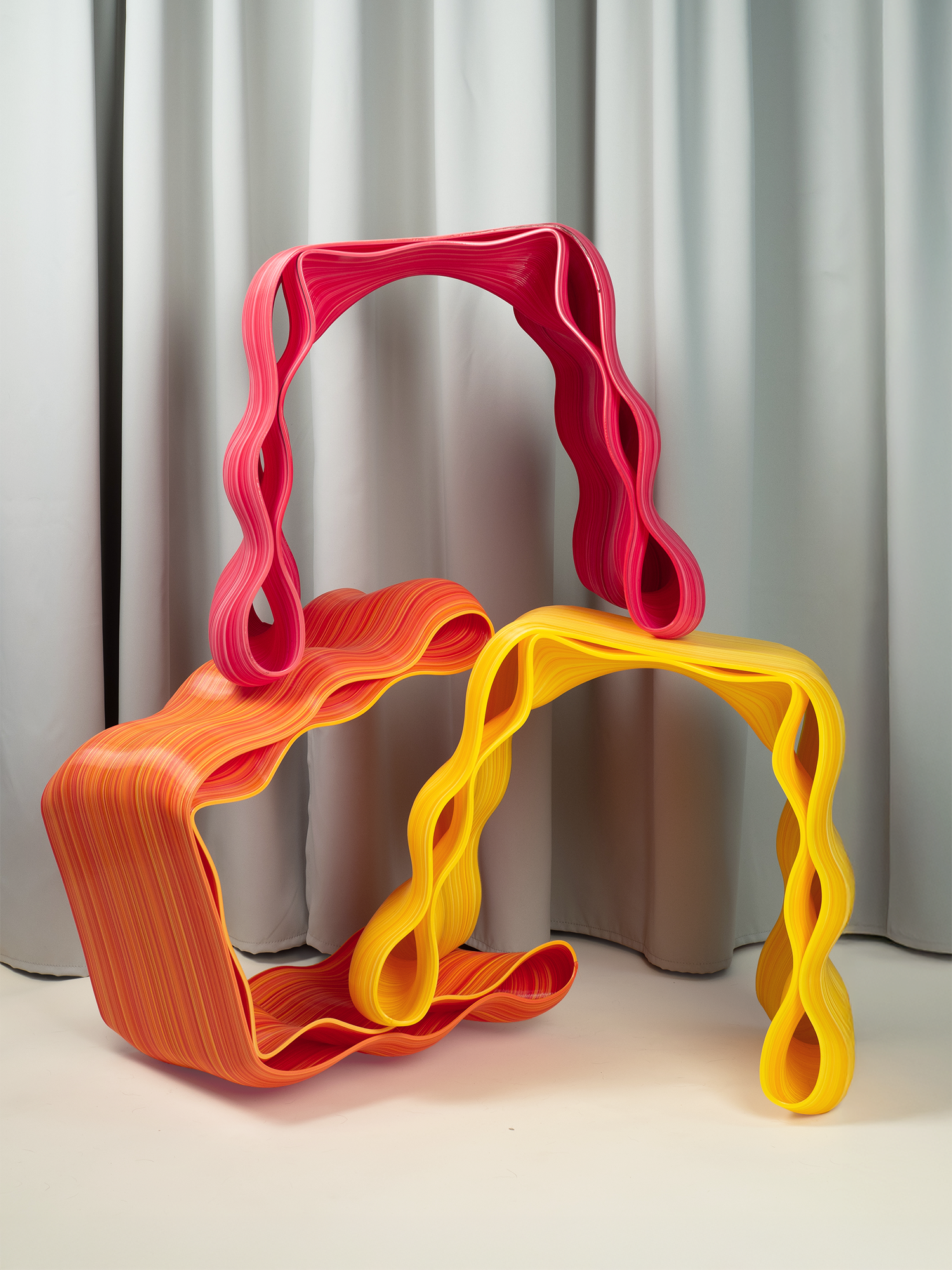 Każdy STOUEK drukowany jest jako jeden, spójny element. Widoczne warstwy wydruku nie są ukrywane, a wręcz przeciwnie, stają się atutem. Ten estetyczny 'szum technologiczny’ przypomina o procesie, który stoi za powstaniem obiektu. Do wyboru mamy wersje monochromatyczne i wielokolorowe odważne, ale nie krzykliwe. To właśnie w tej kontrolowanej ekstrawagancji BLUBA Studio odnajduje swój styl: formy, które są śmiałe, ale nie dominujące; obecne, ale nie przytłaczające.