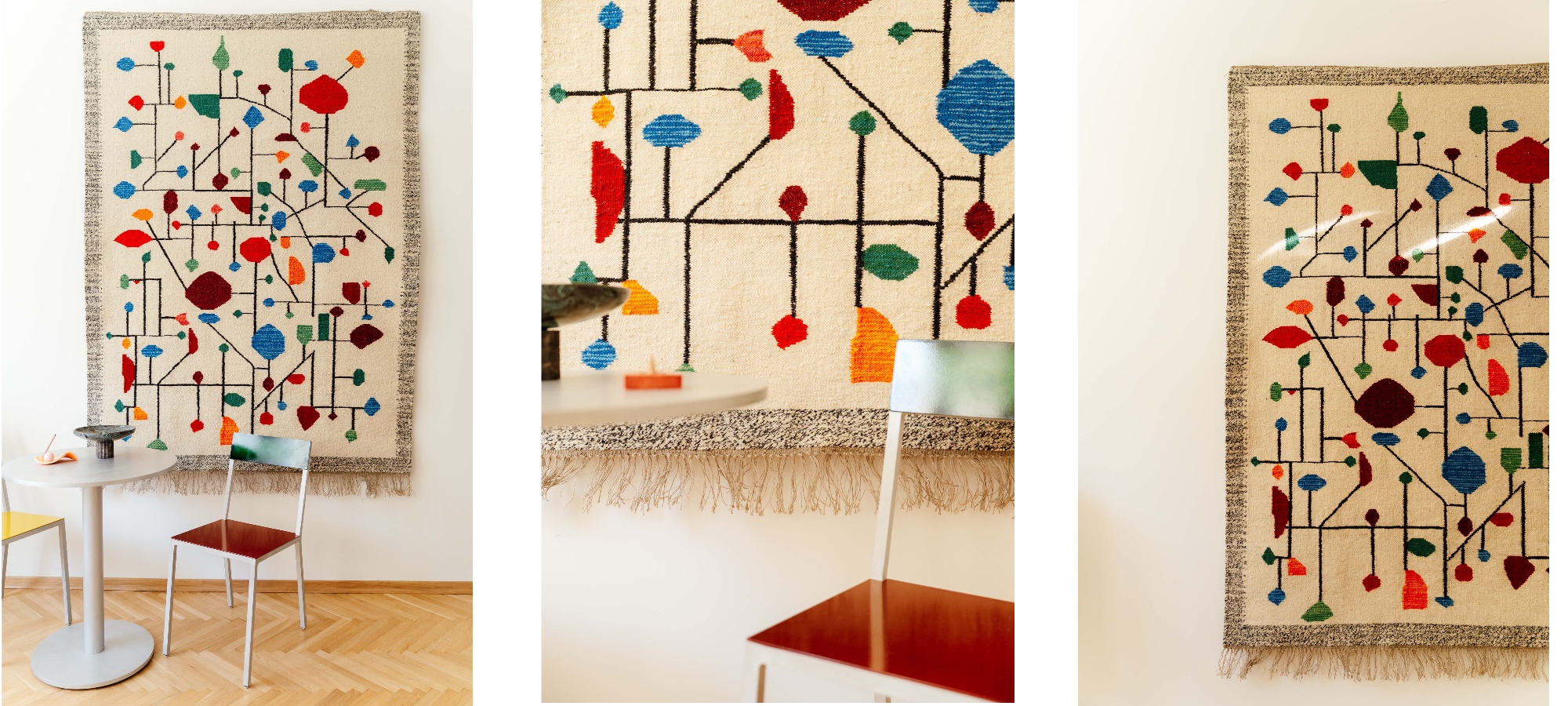 Organiczne, wielobarwne formy na kilimie nawiązują do fascynacji obrazami mikroskopowymi przełomu lat 50. i 60. Do utkania kilimu użyto wełen, które przędziemy ręcznie w Bobowej, w tym naturalnego melanżu z dodatkiem włókien z czarnych owiec.
