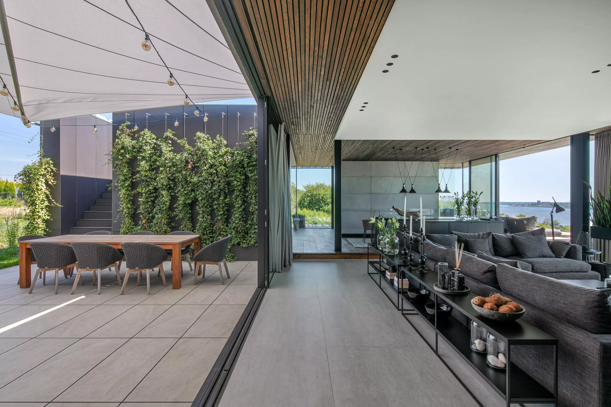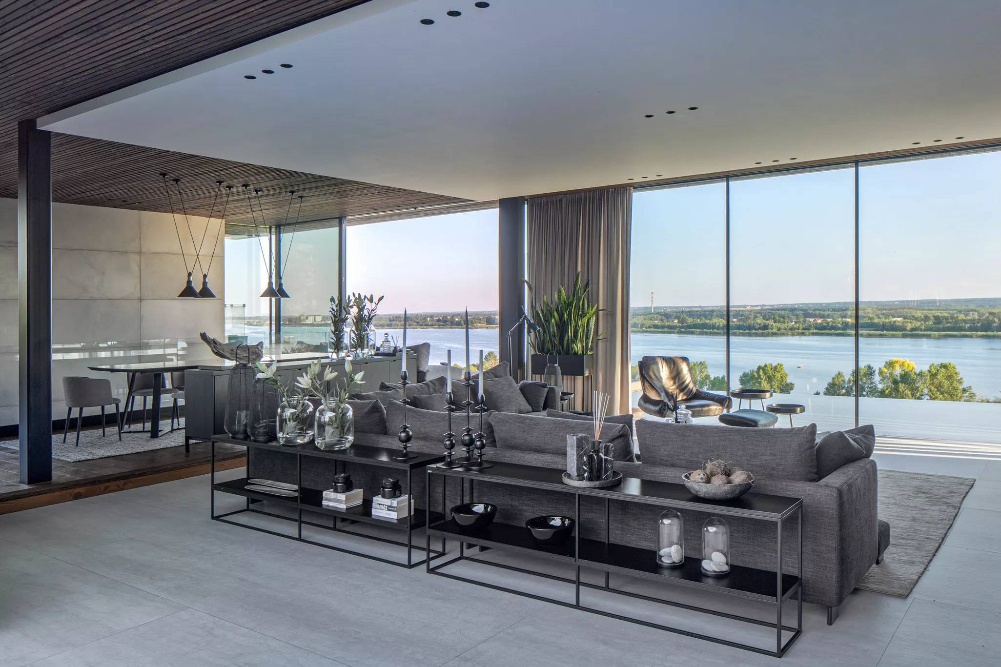 Surowość betonu kontrastuje z ciepłem drewna, a duże przeszklenia rozmywają granicę między wnętrzem a krajobrazem.