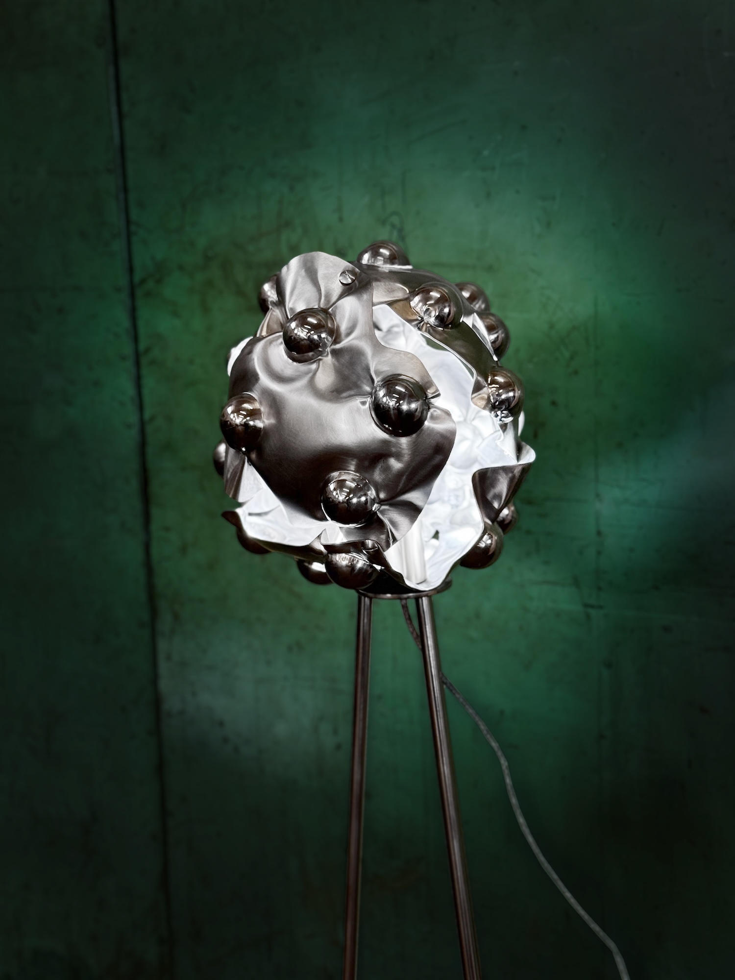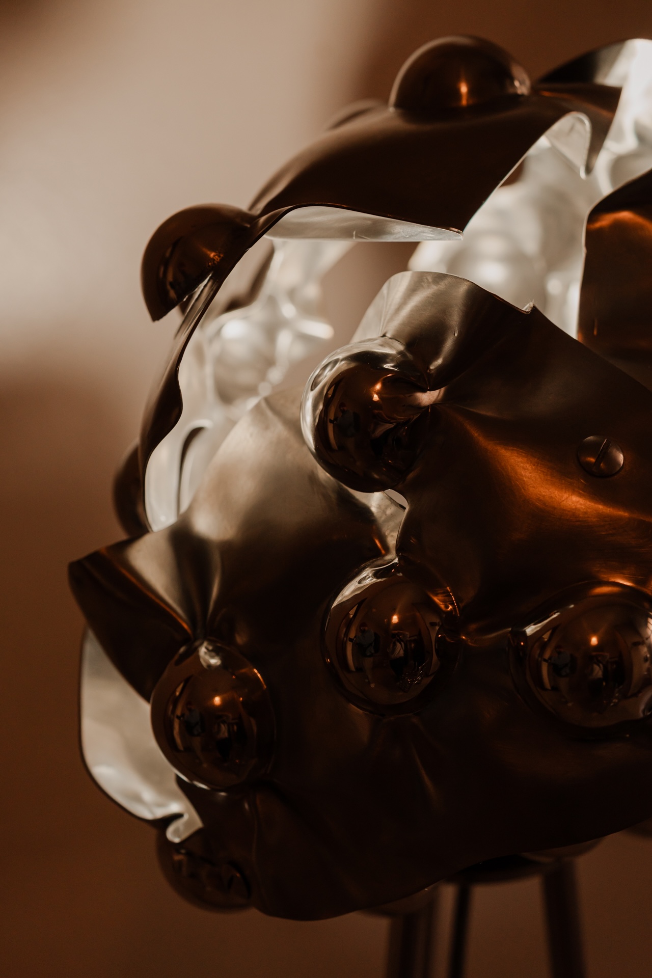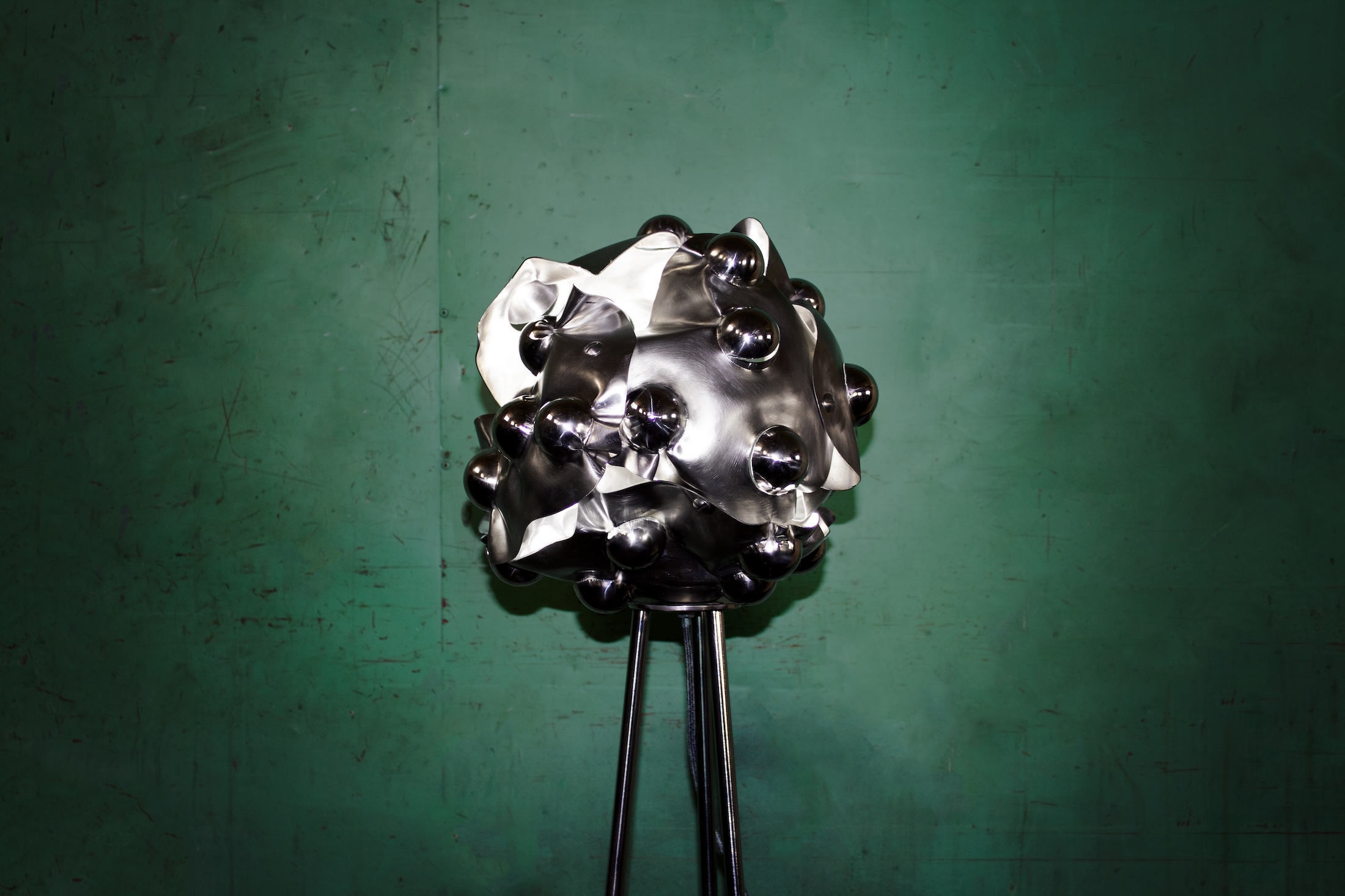 Projekt zrodził się z testów wytrzymałościowych na arkuszach stali nierdzewnej. Zamiast jednak zatrzymać się na badaniach, Sipiora poszedł krok dalej – za pomocą prasy hydraulicznej wycisnął półkolistą formę, która przybrała kształt przypominający powierzchnię meteorytu. Projektant wykorzystał uzyskaną deformację jako podstawę nowej formy. Efekt? Rzeźbiarski obiekt świetlny, którego nieregularność jest jego największym atutem.