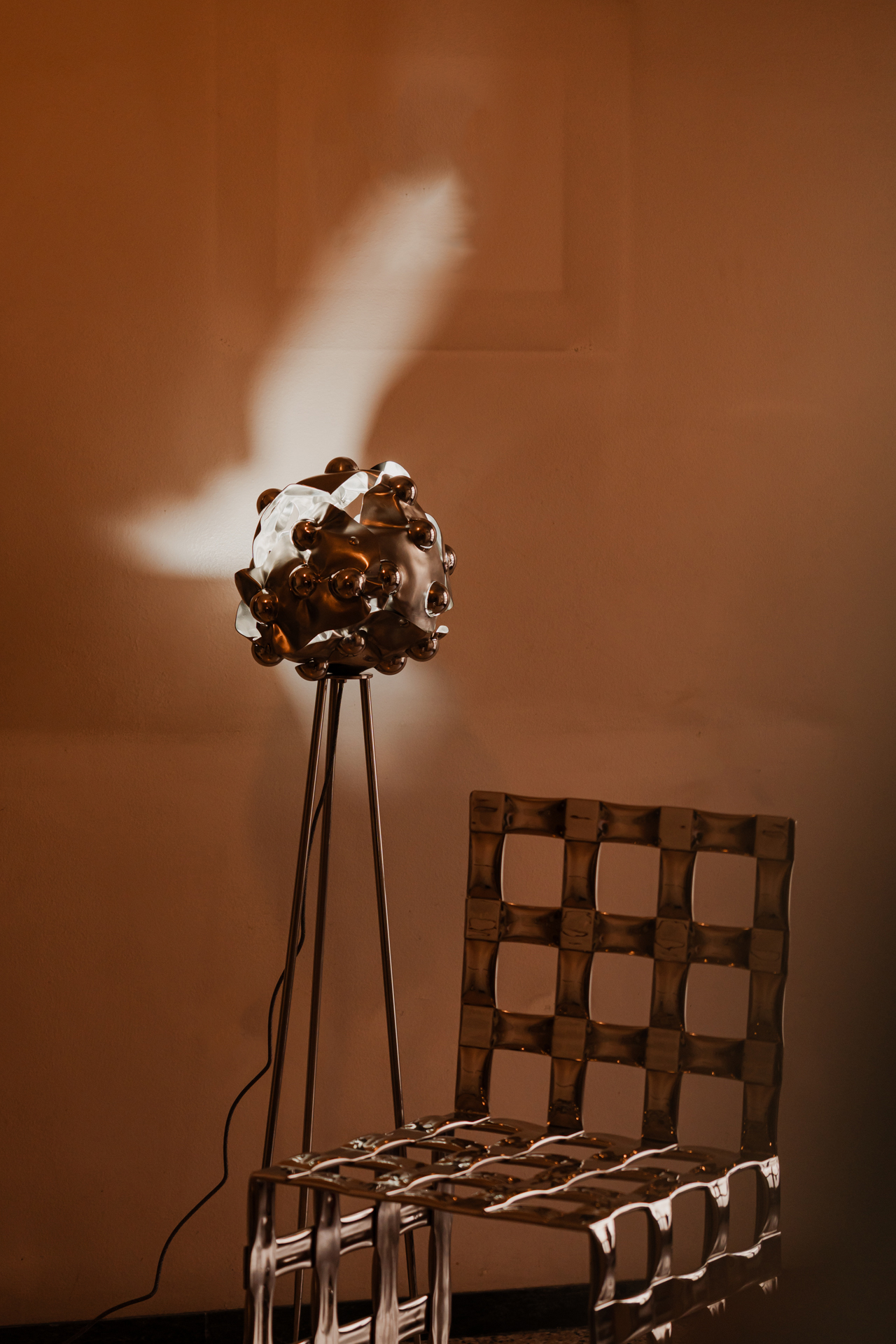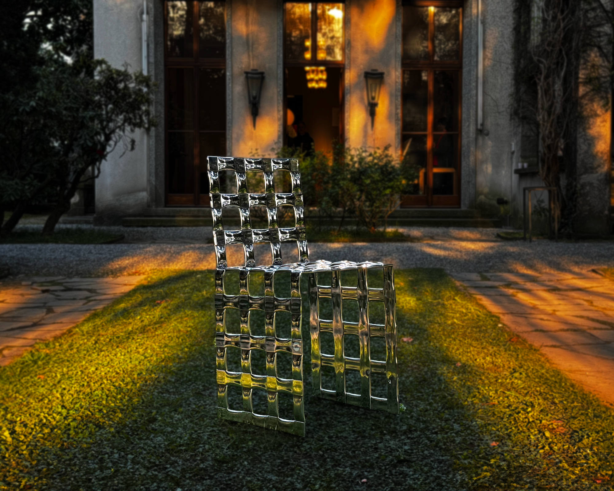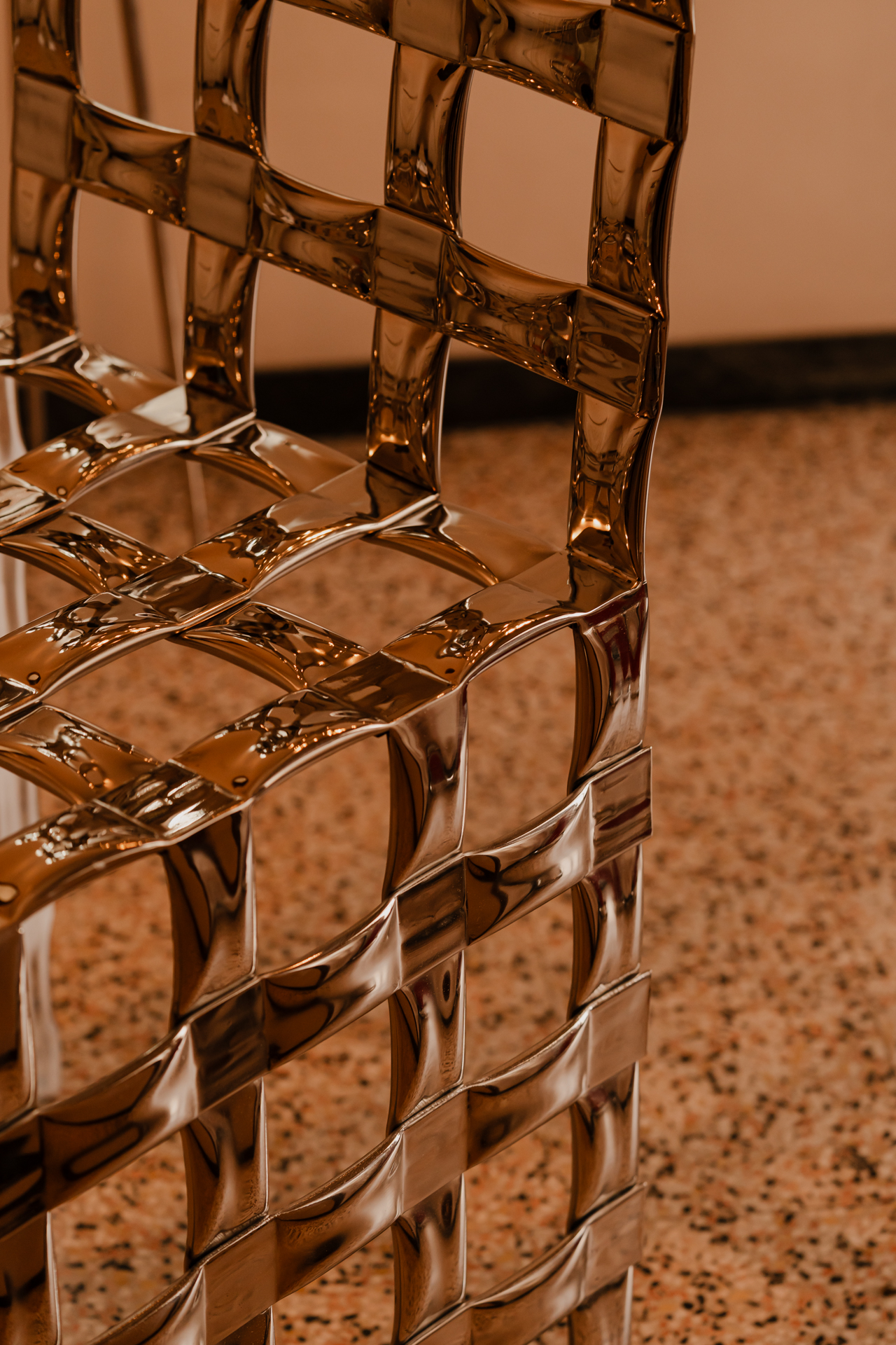 Obok Meteora stanął Phantom – fotel, który mógłby równie dobrze znaleźć się w galerii sztuki współczesnej, jak i w nowoczesnym salonie. Wykonany ręcznie z użyciem autorskiej techniki wyplatania stali, przypomina misternie uplecioną rzeźbę, która – mimo solidnej konstrukcji – zaskakuje lekkością wizualną. Całość została wypolerowana ręcznie, co dodaje obiektowi szlachetnego charakteru. To dzieło, które mówi językiem rytmu, powtórzenia i struktury.