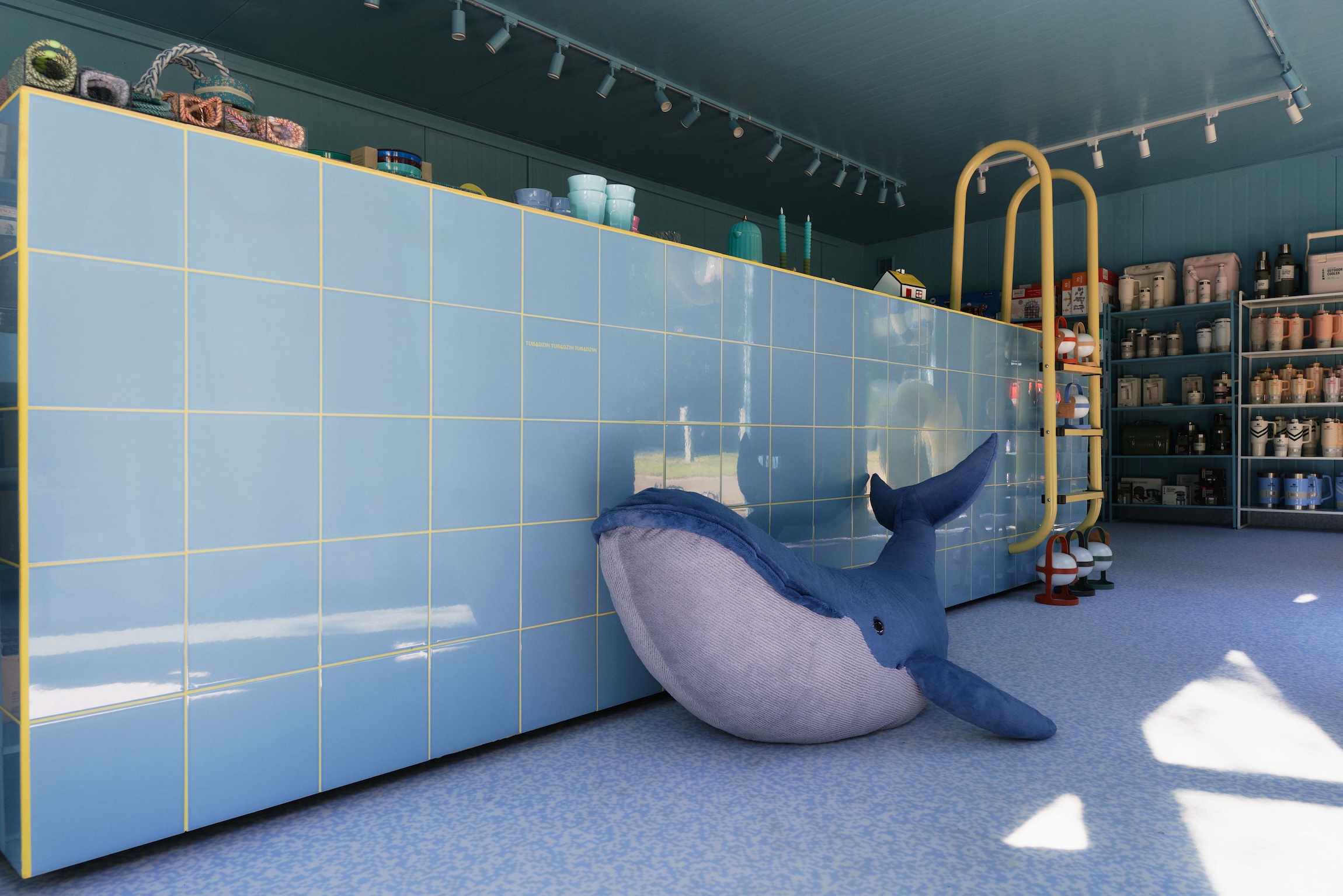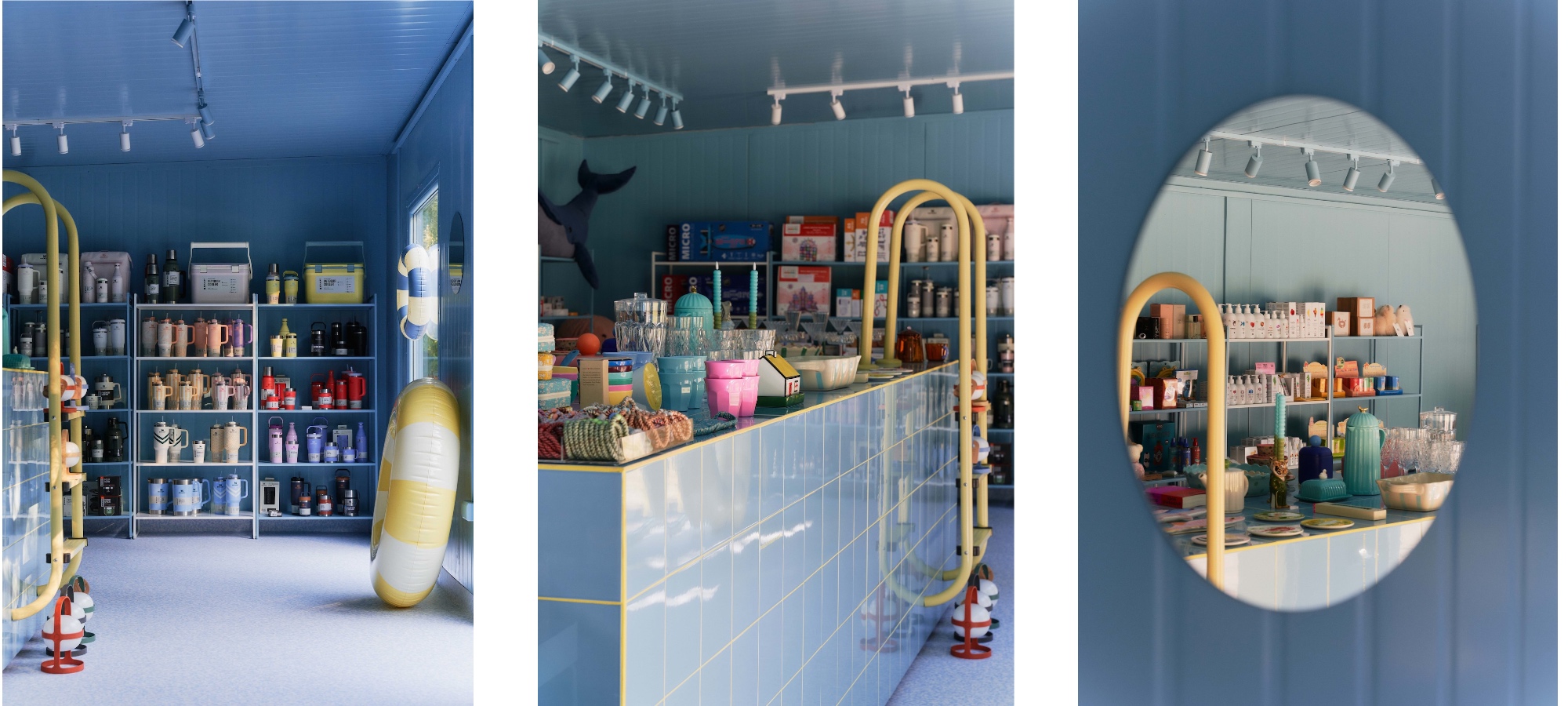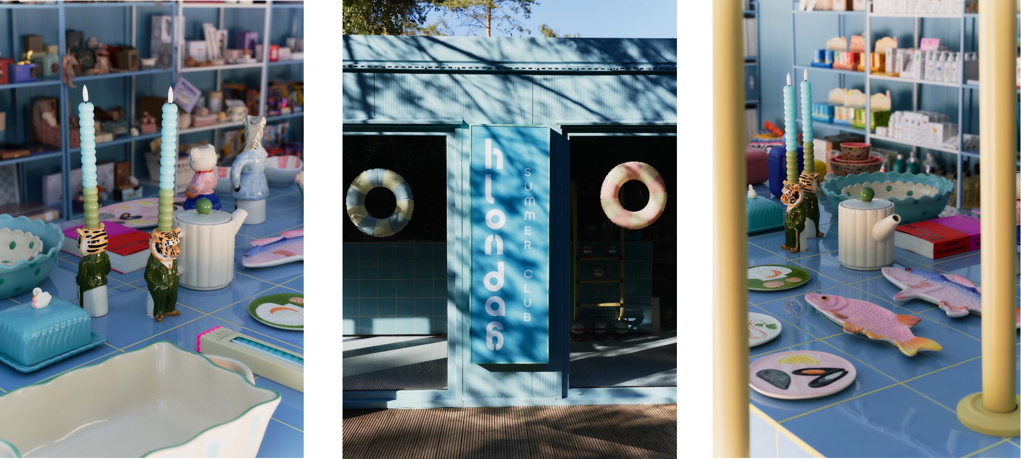 Umieszczony w przekształconym morskim kontenerze, pop-up zachwyca niebanalną formą i nieoczywistym wnętrzem – stylizowanym na modernistyczny basen. W środku: zamiast wody selekcja od hlonda6 – concept store’u znanego z balansowania na granicy designu, sztuki i zabawy. Od podłóg po meble, wszystko zostało zatopione w soczystym, czystym błękicie i rozświetlone promienistymi akcentami koloru słońca. – wszystko dobrane tak, by zamiast sezonowej pamiątki zostawić emocję, wspomnienie i pretekst do opowieści. Dla dzieci, dorosłych, estetów i lekkoduchów.