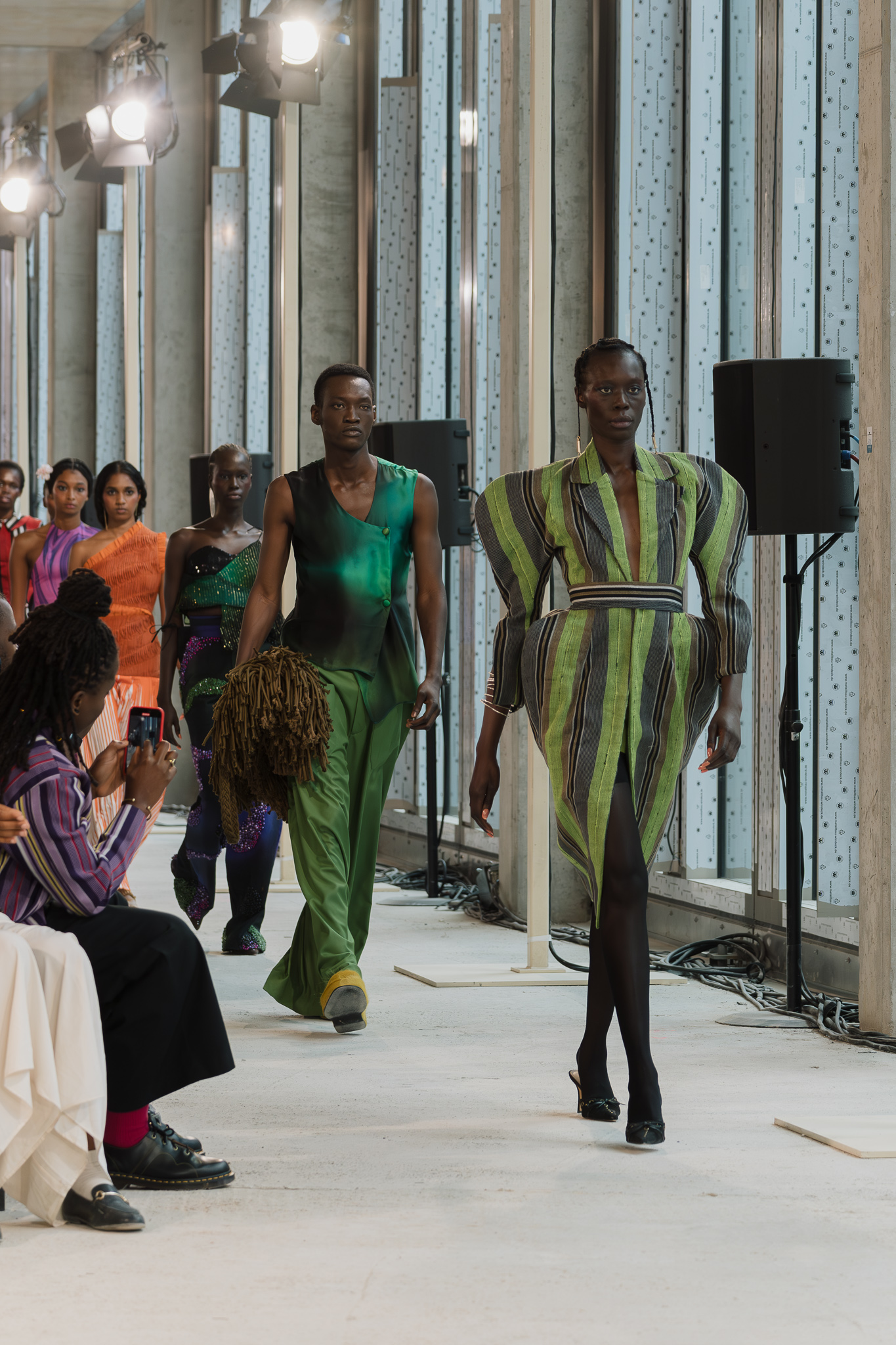 Zachwyciły mnie niekonwencjonalne materiały użyte w projektach takie jak słoma, regenesis, ręcznie tkane aso-oke i koraliki. Razem z etnicznymi mocnymi barwami cały pokaz był nasycony dziecięcą wesołością i energią.