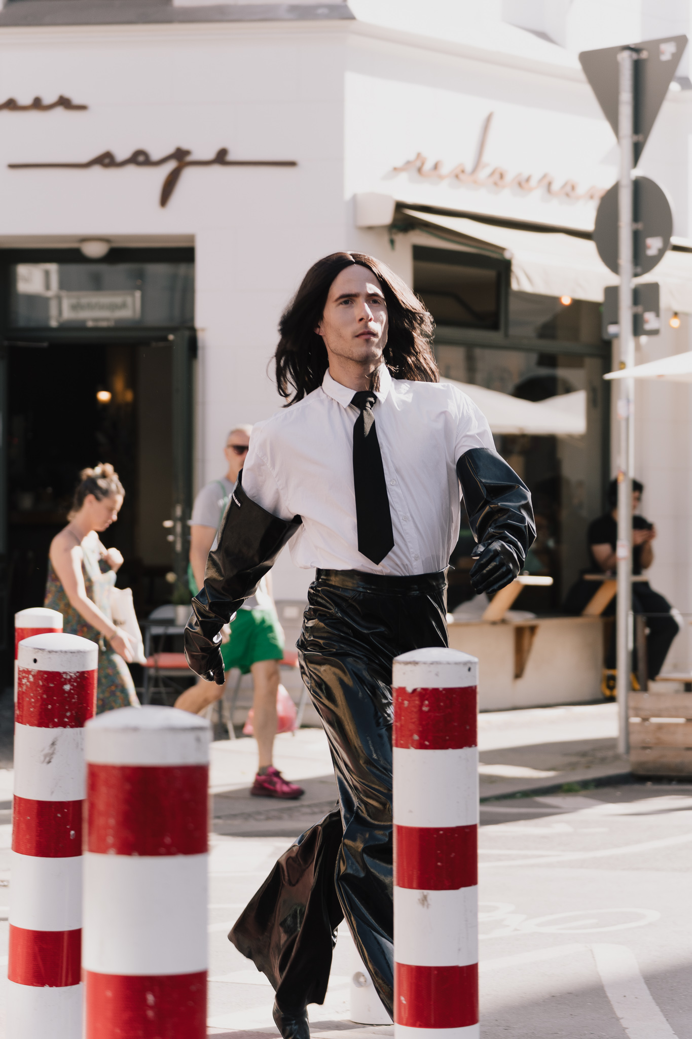 Na próżno szukać tu ludzi ubranych od stóp do głów w designerskie marki i świecących logotypami – dominuje za to wsparcie wschodzących artystów. Moją uwagę w tym roku przykuł polski akcent – zachwyciłam się kolekcją Kasi Kucharskiej, pełną nieoczywistych struktur, kołnierzy z kapturami, czy ciekawych silikonowych akcesoriów. Uwielbiam charakterystyczne projekty Damiana Malesy czy Artura Majki, które nosili polscy goście pokazów… idealnie wpasowały się w ducha miasta.