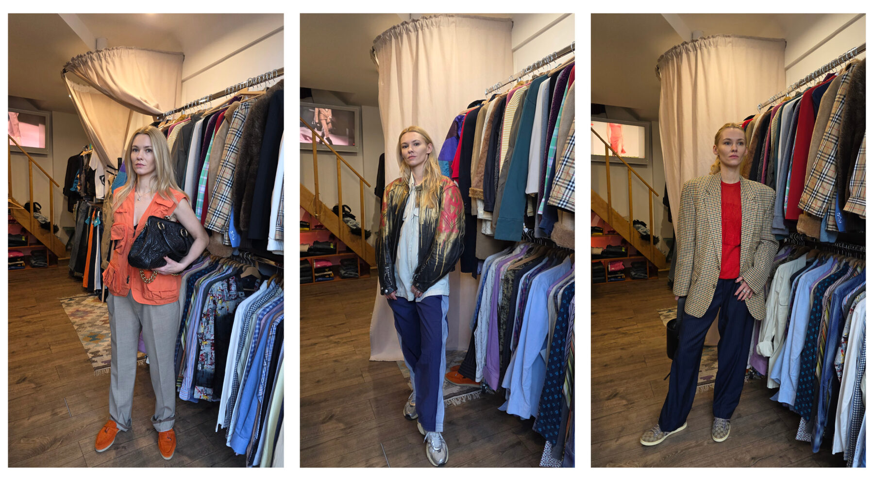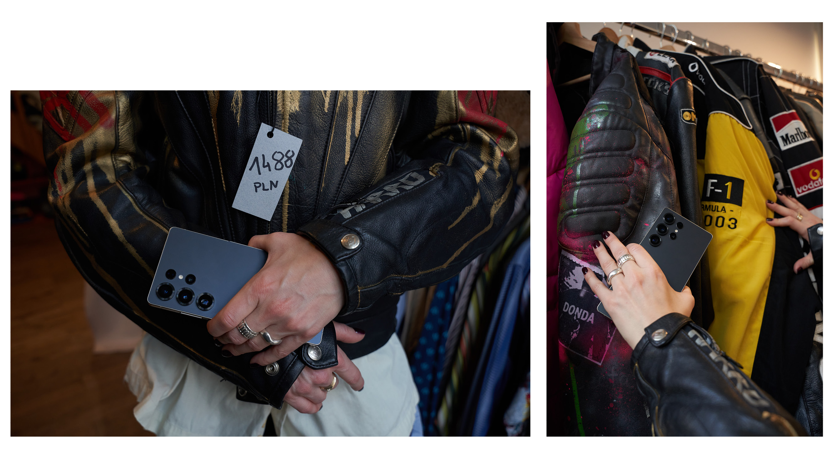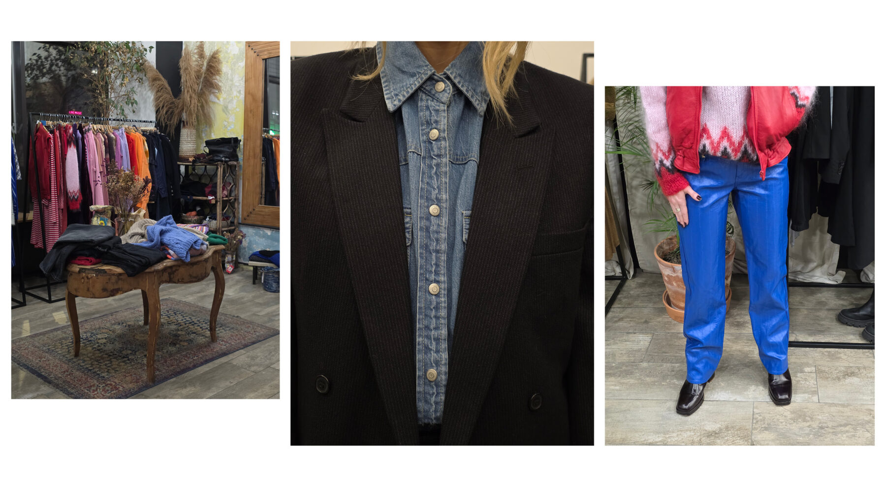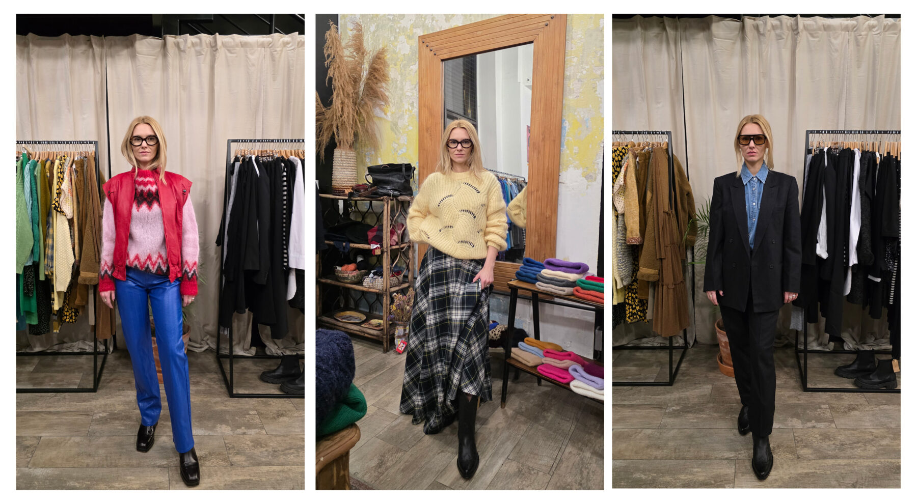 Trzeci vintage shop, który mamy na liście to Pracownia Vintage, usytuowana na Placu Konstytucji. To zdecydowanie większa przestrzeń niż dwie poprzednie z bardziej dopaminową kolorystyką. W oczy rzucają nam się niebieskie, skórzane spodnie i zupełnie naturalnie łączą się w drodze do przymierzalni z różowym swetrem i czerwoną kamizelką. Tak powstaje pierwsza stylizacja, nawiązująca do coraz popularniejszego ostatnio stylu après-ski przełomu lat 80. i 90. Przy okazji przekonujemy się, że narzędzie Circle to Search by Google, w które wyposażona jest aplikacja apartu Galaxy S25 z 5-krotnym zoomem optycznym i 10-krotnym zoomem AI jakości optycznej bez problemu radzi sobie z prawidłowym rozpoznaniem materiału tych niebieskich spodni i podrzuca podobne wyniki. To bardzo przydatne narzędzie, jeśli rzeczywiście chcemy budować naszą vintage garderobę w oparciu o to, co widzimy na ulicy. Kolejny stworzony zestaw to rustykalny knitwear sweter i geometryczna kraciasta spódnica. Klasycznie, ale z nutą pieprzu. Na koniec nieco odważniejsza stylizacja w odsłonie unisex z czarną, overseize’ową marynarką, denimową koszulą i eleganckimi męskimi spodniami. Efekt uzupełniają kwadratowe okulary z brązowymi oprawkami. Tym mocniejszym lookiem kończymy naszą zabawę.