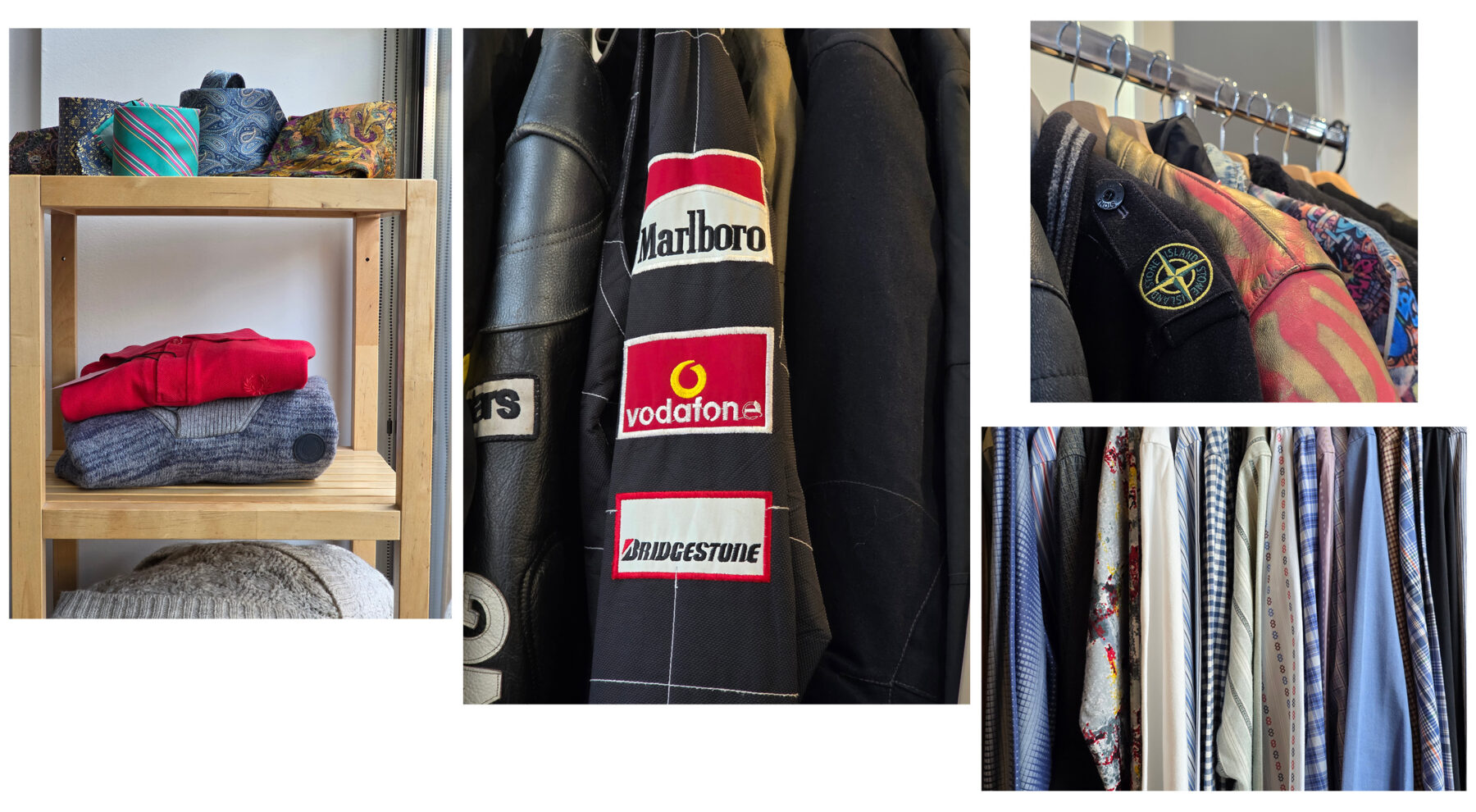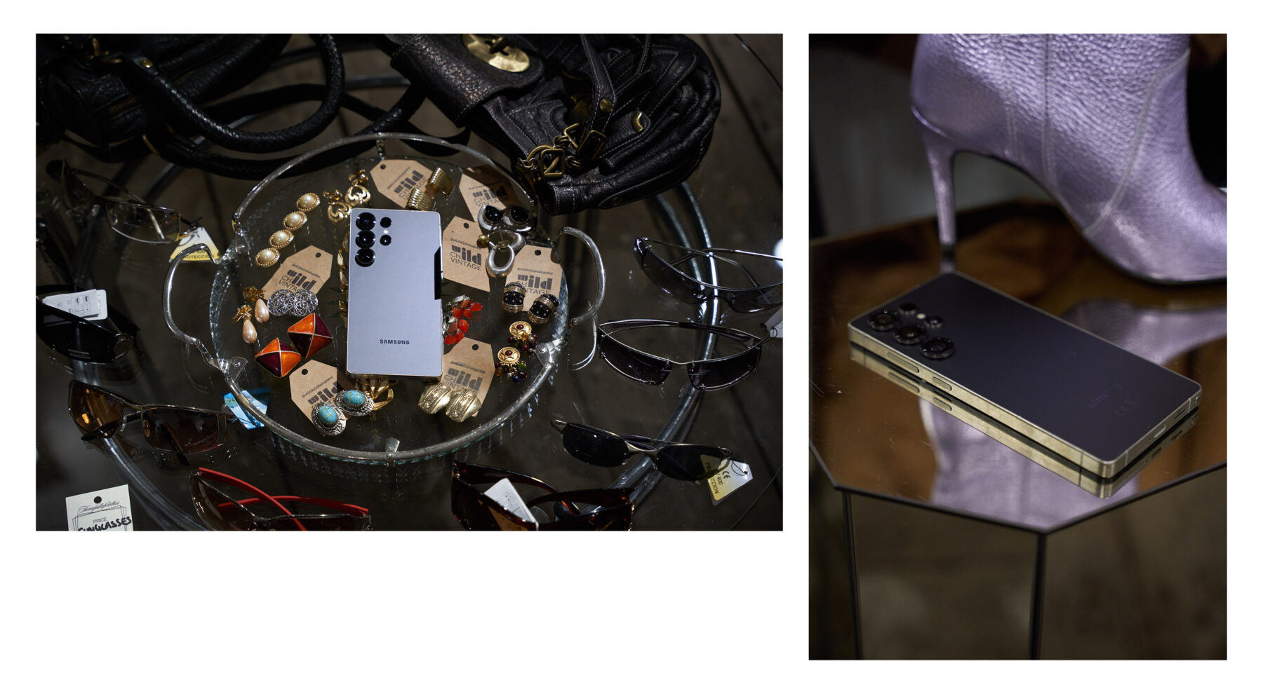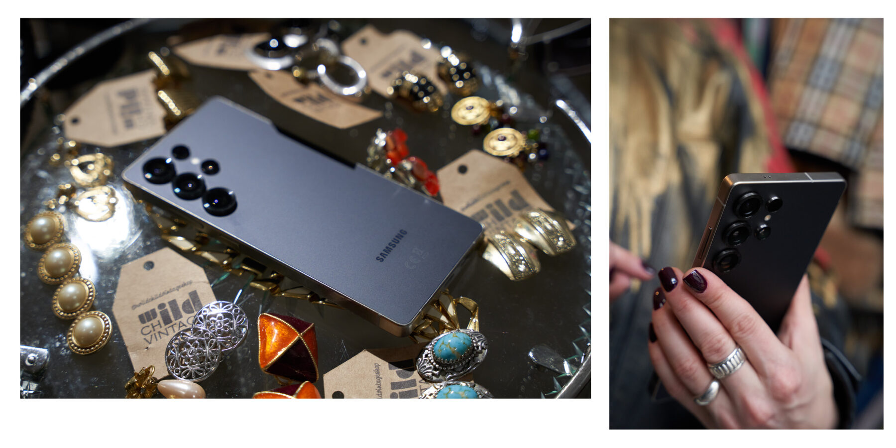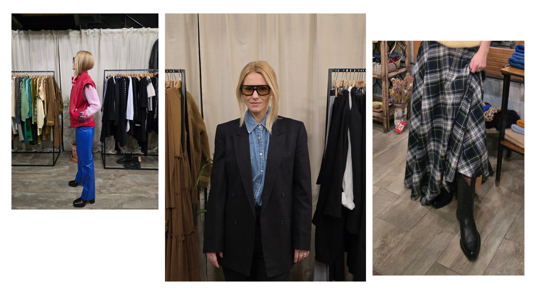 Trzeci vintage shop, który mamy na liście to Pracownia Vintage, usytuowana na Placu Konstytucji. To zdecydowanie większa przestrzeń niż dwie poprzednie z bardziej dopaminową kolorystyką. W oczy rzucają nam się niebieskie, skórzane spodnie i zupełnie naturalnie łączą się w drodze do przymierzalni z różowym swetrem i czerwoną kamizelką. Tak powstaje pierwsza stylizacja, nawiązująca do coraz popularniejszego ostatnio stylu après-ski przełomu lat 80. i 90. Przy okazji przekonujemy się, że narzędzie Circle to Search by Google, w które wyposażona jest aplikacja apartu Galaxy S25 z 5-krotnym zoomem optycznym i 10-krotnym zoomem AI jakości optycznej bez problemu radzi sobie z prawidłowym rozpoznaniem materiału tych niebieskich spodni i podrzuca podobne wyniki. To bardzo przydatne narzędzie, jeśli rzeczywiście chcemy budować naszą vintage garderobę w oparciu o to, co widzimy na ulicy. Kolejny stworzony zestaw to rustykalny knitwear sweter i geometryczna kraciasta spódnica. Klasycznie, ale z nutą pieprzu. Na koniec nieco odważniejsza stylizacja w odsłonie unisex z czarną, overseize’ową marynarką, denimową koszulą i eleganckimi męskimi spodniami. Efekt uzupełniają kwadratowe okulary z brązowymi oprawkami. Tym mocniejszym lookiem kończymy naszą zabawę.