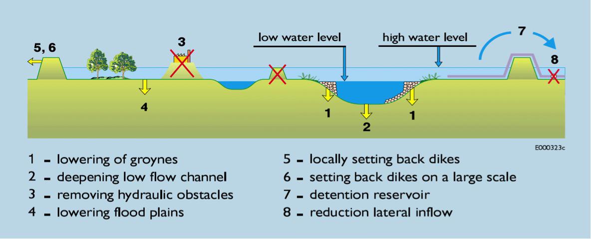 Uznano, że woda będzie się pojawiać, że powodzie czy przynajmniej okresowo są nieuniknione, ale że możemy tak projektować przestrzeń, infrastrukturę, system użytkowania terenu, by minimalizować szkody, zwiększać odporność, dawać naturze określoną rolę. Jednym z kluczowych przykładów tej zmiany jest projekt Room for the River (po niderlandzku Ruimte voor de Rivier). Program ten rozpoczął się w około 2006–2007 roku. Holenderski rząd postanowił, że zamiast polegać wyłącznie na wysokości i sile wałów, grobli i tam to da się rzekom więcej miejsca na rozlanie się, gdy poziom wody będzie wysoki. W ramach Room for the River przygotowano ponad 30 lokalizacji, gdzie podejmowane są konkretne działania takie jak: przesuwanie wałów bliżej lądu, co daje więcej obszaru dolinom rzecznym; pogłębianie i poszerzanie bocznych kanałów (side channels), by mogły przyjąć nadmiar wody; tworzenie terenów zalewowych, które są projektowane tak, by w momencie wysokiej wody mogły być okresowo zalewane, odciążając główne wały; budowa kanałów obejściowych („flood bypasses”), gdzie woda może być skierowana, by ominąć miejscowo zabudowane części doliny; usuwanie przeszkód w korytach rzek, które ograniczają przepływ, więc mostów, wałów bocznych lub struktur hydrotechnicznych, które powodują spowolnienie lub spiętrzenie wód.