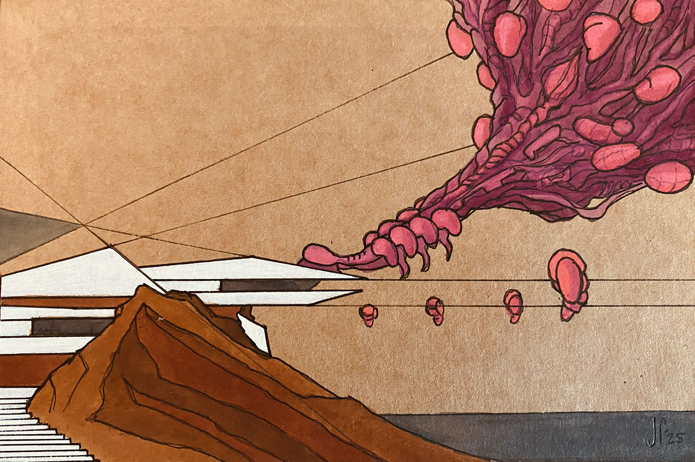 Seria Intervention, wykonana akwarelą, gwaszem i tuszem, przedstawia abstrakcyjne, modernistyczne formy architektoniczne wtłaczane w rozległe, często pustynne pejzaże. To wizualne alegorie ludzkiego pragnienia ujarzmienia nieznanego, przekształcenia nieskończoności w coś „do ogarnięcia” — w miejsce, które można zdefiniować, zaplanować, nazwać. Te geometryczne interwencje zdają się mówić: „Jesteśmy tu, by zapanować nad chaosem”. Ale jak długo to może trwać?