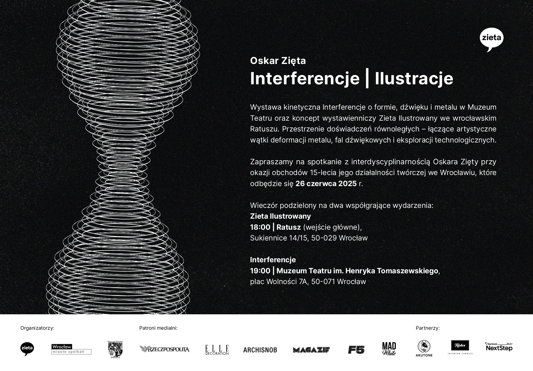 Artysta, projektant i technolog, którego prace balansują między rzeźbą a inżynierią, zaprasza nas do dwóch przestrzeni doświadczeń – kinetycznej wystawy Interferencje oraz ilustrowanego uniwersum Zieta Ilustrowany. 26 czerwca 2025 roku to data, której miłośnicy designu, sztuki i eksperymentu nie powinni przegapić. Wieczór rozpocznie się o godzinie 18:00 w Ratuszu – Zieta Ilustrowany, by godzinę później przenieść się do Muzeum Teatru – Interferencje. Dwa miejsca. Dwa języki. Jedna wizja.
