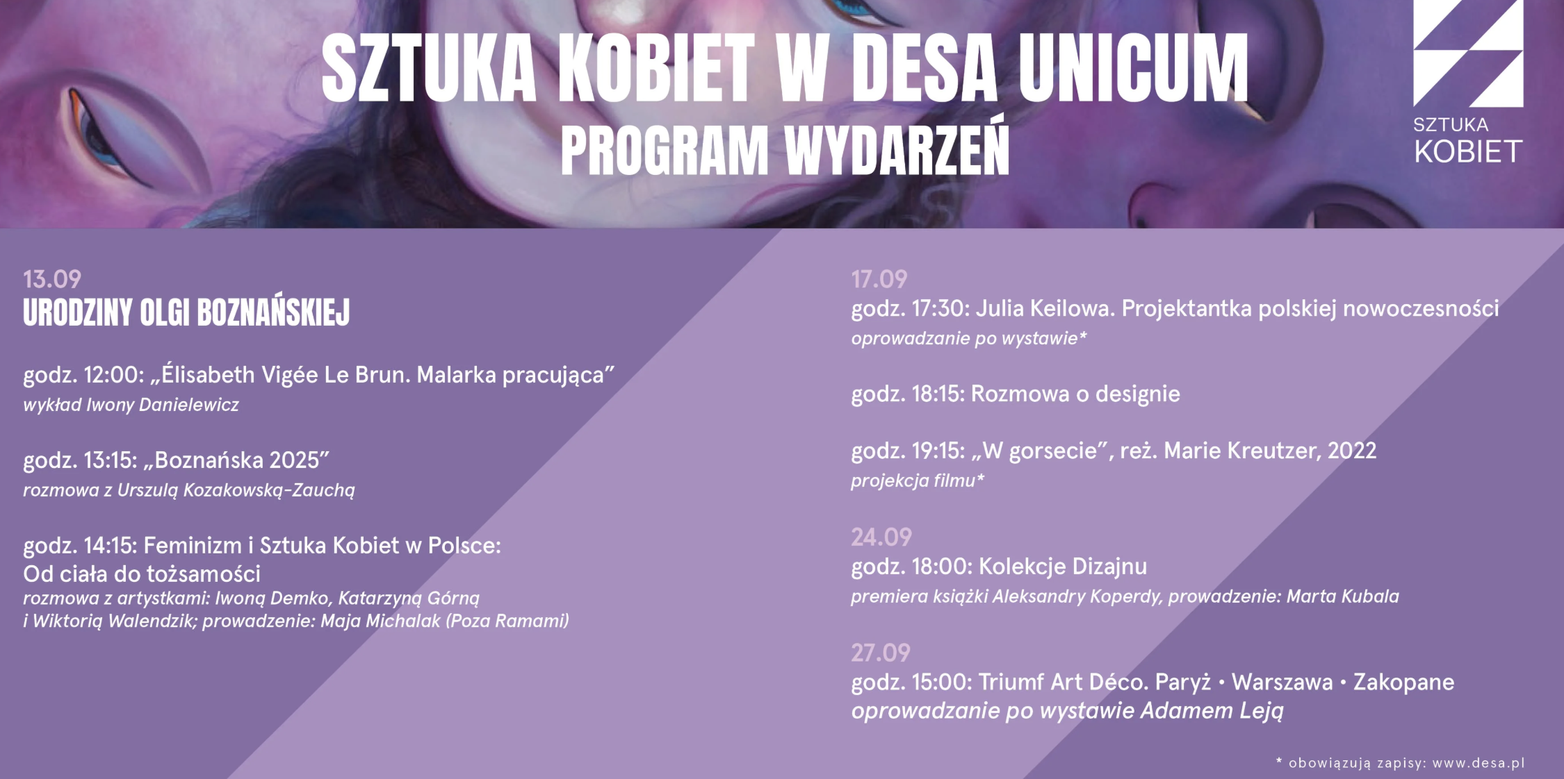Ważną częścią programu będą wydarzenia towarzyszące, wykłady, panele, oprowadzania kuratorskie i projekcje filmowe. W dniu urodzin Boznańskiej (13 września) DESA Unicum zamieni się w przestrzeń rozmowy o kobiecym dziedzictwie: od prelekcji o Élisabeth Vigée Le Brun po dyskusje z artystkami młodego pokolenia. W planach znalazł się także plenerowy pokaz filmu 'W gorsecie’ w reż. Marie Kreutzer – portretu cesarzowej Sisi, kobiety, która próbowała wyrwać się z ograniczeń epoki.