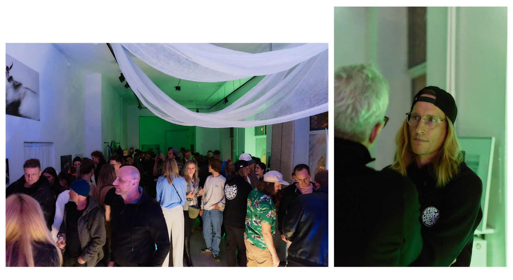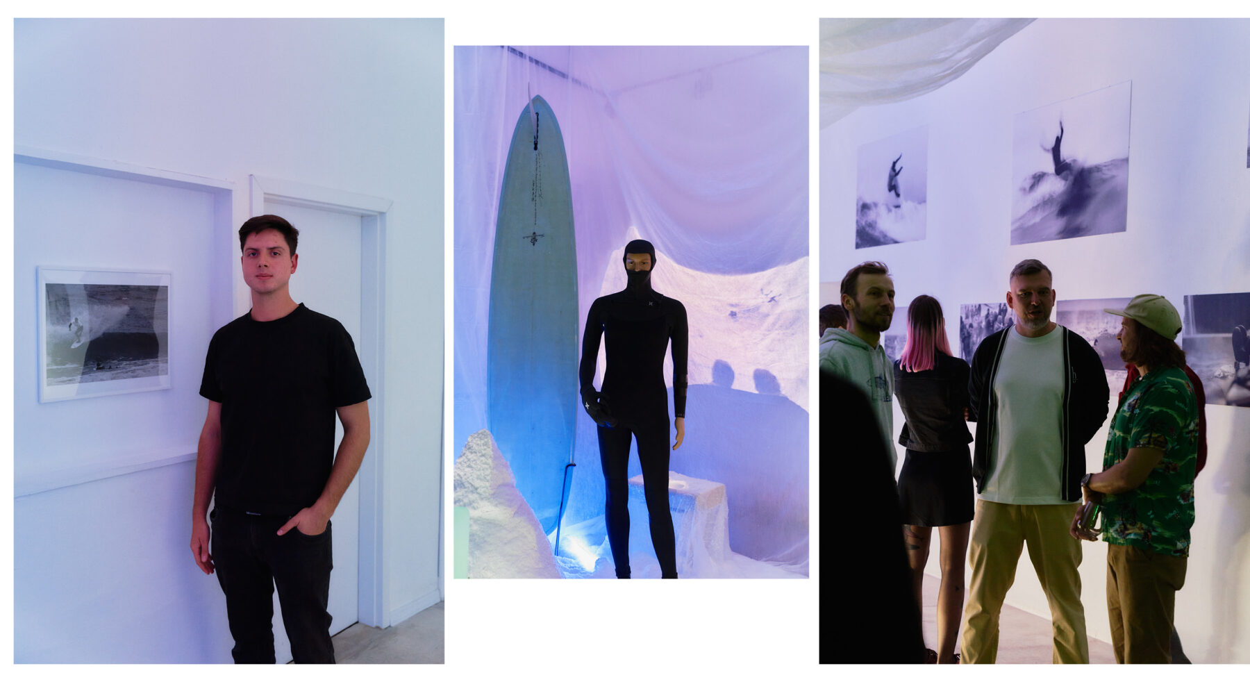 Oprócz zdjęć w specjalnie przygotowanej przez Zuzię Iwaniuk scenografii można oglądać projekty desek surfingowych wyshape’owane przez warszawskiego shapera Dominika Bachara z DB Shape Boards. Jest wśród nich longboard pokryty włóknem lnianym, short, a także pre-shape, który pokazuje z jakich dokładnie elementów składa się deska surfingowa. Podczas wernisażu Dominik opowiedział o procesie shape’owania desek. Okazuje się, że ich kształt w decydującym stopniu zależy od stylu, umiejętności i oczekiwań ridera. – Muszę być dobrym słuchaczem – śmieje się Dominik. Gdy deska jest prawie gotowa może trafić pod projekty designera Aleksandra Lange ze studia Lange & Lange, który również był na wernisażu i pokazał kolekcję desek z grafikami zaprojektowanymi specjalnie dla trzykrotnego mistrza świata i obecnego brązowego medalistę olimpijskiego Gabriela Medinę (tak, to ten z najlepszego zdjęcia igrzysk w Paryżu). – W sumie przygotowaliśmy dla niego 8 projektów desek, a jeden z nich kupił Jimmy Butler z Miami Heat (teraz Golden State Warriors), gdy grali w finałach NBA z Nuggets w 2023 roku, bo spodobał mu się motyw płonącej piłki koszykówki (nawiązuje do logo drużyny z Florydy – przyp. red.) – opowiada Olek.