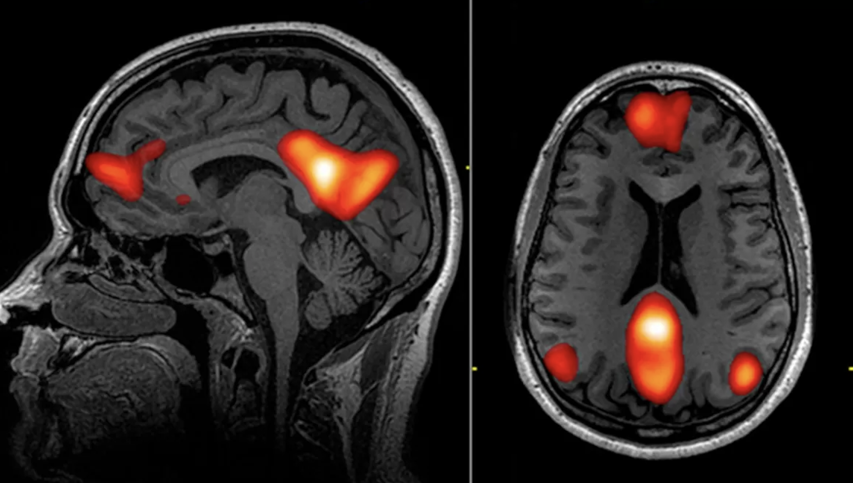 W badaniach z użyciem funkcjonalnego rezonansu magnetycznego (fMRI) wykazano, że pod wpływem psylocybiny aktywność DMN znacząco spada.