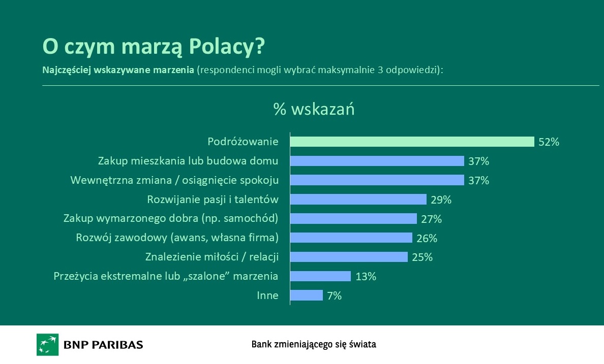Bank BNP Paribas przeprowadził też badania: Jak marzą Polacy? Co ich motywuje, a co zatrzymuje? Wyniki są dostępne w raporcie na stronie bnpparibas.pl/godreams.