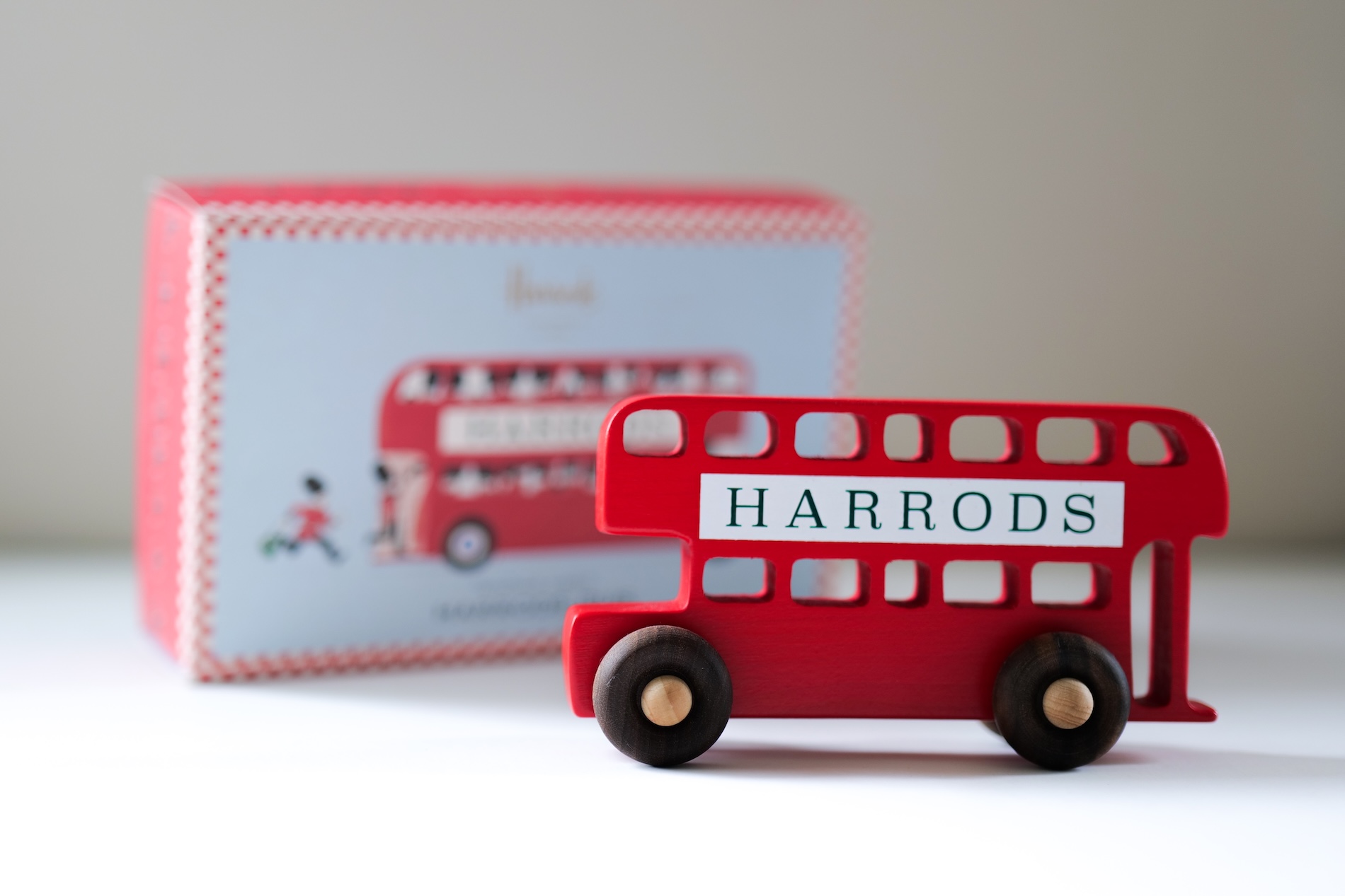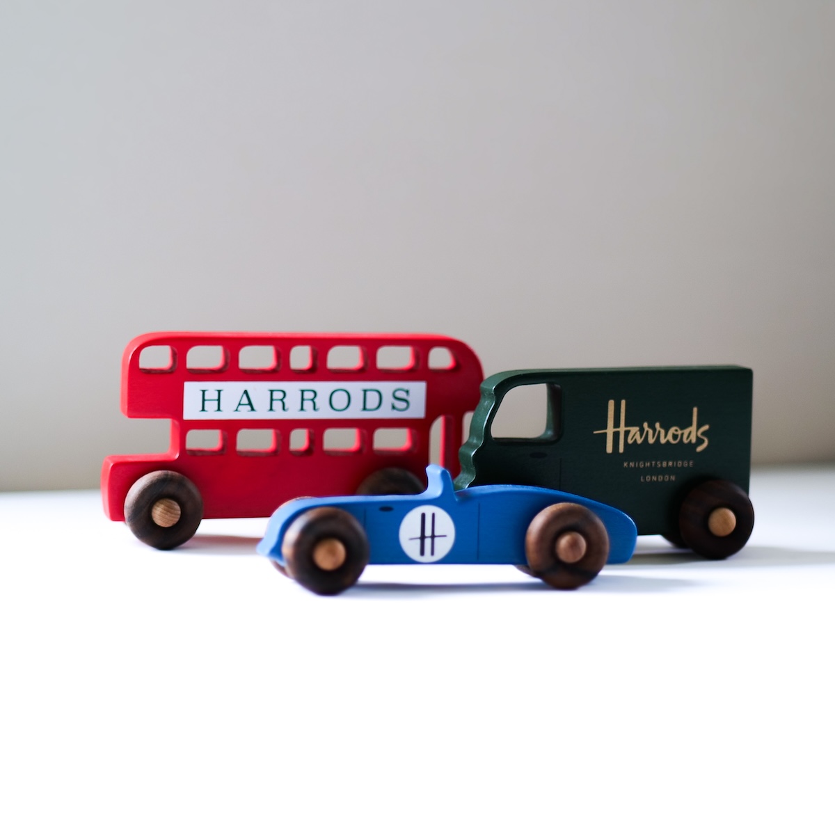 Na początek na półki Harrodsa trafiły wyjątkowe produkty stworzone specjalnie dla tej współpracy: drewniane autka – w tym kultowy czerwony londyński piętrowy autobus, elegancki Harrods delivery van i dynamiczny racing car. Jest też zabawka inspirowana znanym z kolekcji Wooden Story „Twist the Blocks”, oraz ponadczasowa gra w kółko i krzyżyk w zupełnie nowym wydaniu.